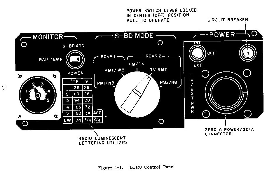 [There is a monitor switch and gauge on the left side of the LCRU control panel. The numbers on the dial are translated in the small chart just to the right of the gauge. A temperature of 1.8 corresponds to about 60F, and a power of 2.1 translates as a bus voltage of about 28. By going to Internal power, Gene was using internal LCRU batteries to power the monitoring devices. Once he has his readings, he switches back to the Rover batteries (External) for normal LCRU operation.]118:13:25 Cernan: Okay, Power is External. Mode Switch is going to 2 - FM/TV. Okay. Man, did you peak out at signal strength of four-oh. I can't see right now, but I think I've still got you right in the center. (Pause) Okay, Power switch on the TCU. Okay, it's on the TCU. Okay, AGC and Power. Yes sir, Bob, I'm verifying at four-oh. That's a good Navy term, "four-oh" on the AGC.