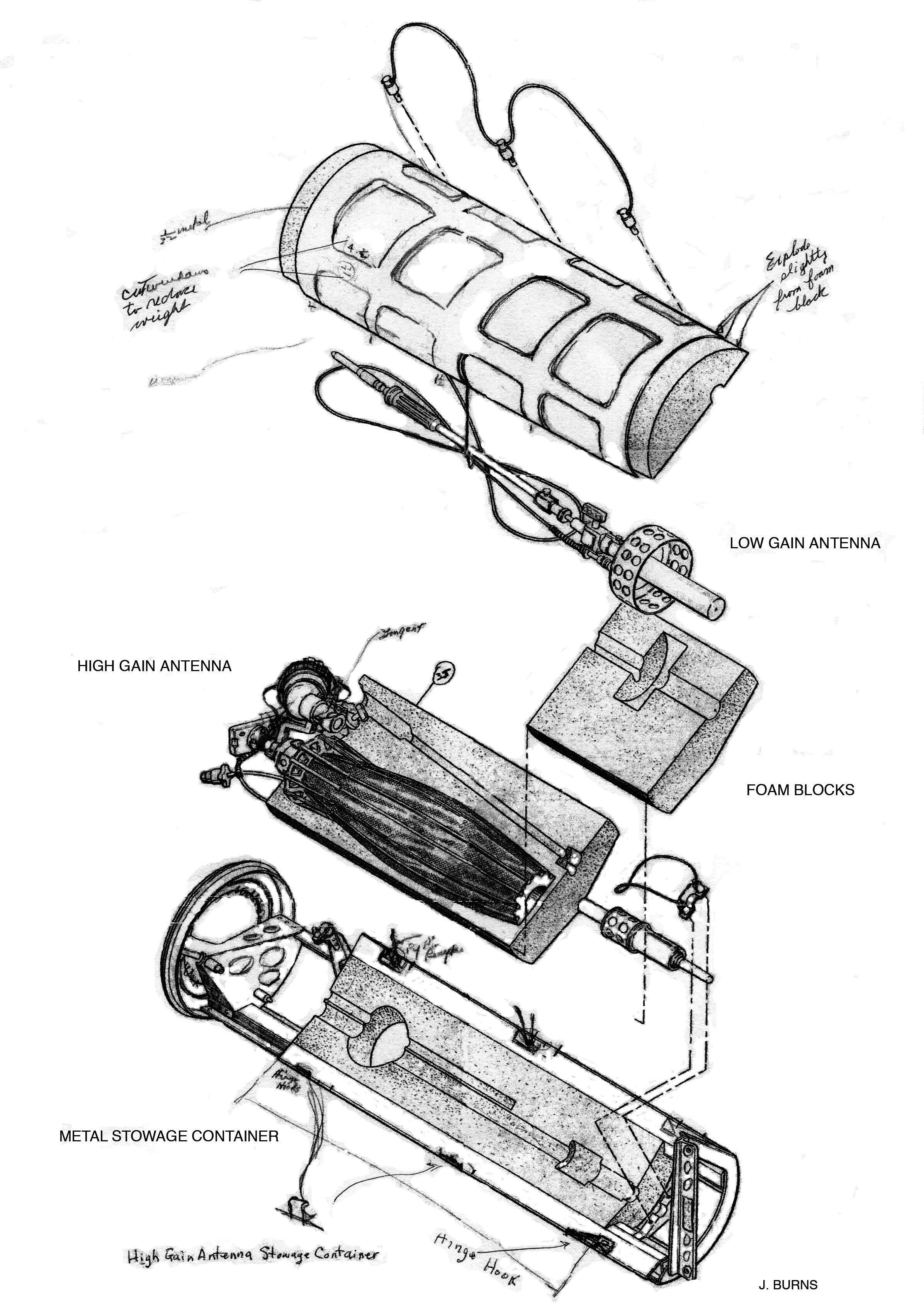 [Both the low-gain and high-gain antennas are in a storage container stowed on the left side of the MESA. Retired RCA technical illustrator James Burns has provided a drawing of the antenna storage canister he did prior to Apollo 15.]118:01:30 Schmitt: (Referring to the Rover power-up) Felt like a Rover, huh, Geno?[During the traverses, the low-gain antenna (LGA) will be used for voice communications with Earth. Because a voice signal doesn't have to carry nearly as much information as a TV signal, the broadcast strength can be weaker for voice and the antenna pointing doesn't need to be more accurate than about 30 degrees. Gene will fit the antenna mast into a socket on his T-handle.]