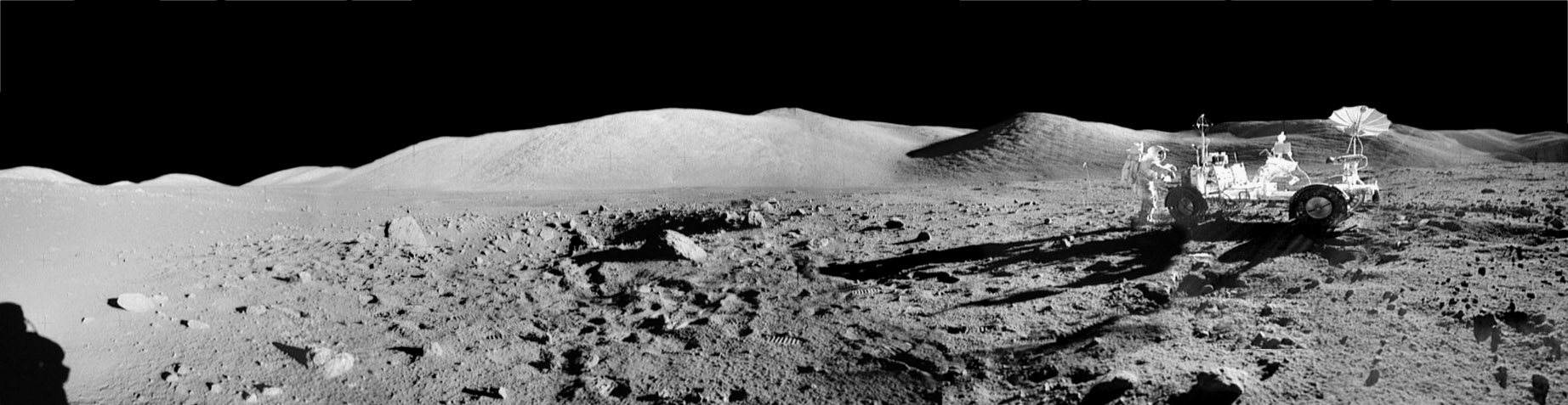 [Harland calls attention to the difference in shadow lengths in this view compared with the lengths of the astronaut shadows in Gene's early pan. The dominant factor that produces the different shadow lengths is the different ground slopes on which the shadows are falling at this low Sun angle. A comparison of the pans suggest that Gene parked on a slight rise. Note, for example, that the Rover shadow can not be seen in Gene's pan, which was taken from east of the Rover. Clearly, the Rover shadow visible in Jack's pan falls on a downslope - relative to the Sun - while the astronaut shadows in Gene's pan may fall on an upslope. The Sun is about 18 degrees and, on a level surface, a 2-meter-high suited astronaut would cast a 6.15 meter shadow. A modest two degree upslope would reduce the shadow length to 5.49 meters while a two degree downslope would increase it to 6.97 meters. A second factor which influences perceptions of shadow length is orientation of the shadow relative to the observer. In Gene's pan the astronaut shadows fall more or less along the line of sight, which can make them look shorter than they really are while, in Jack's pan, the shadows run more nearly across the line-of-sight and suffer little foreshortening.]