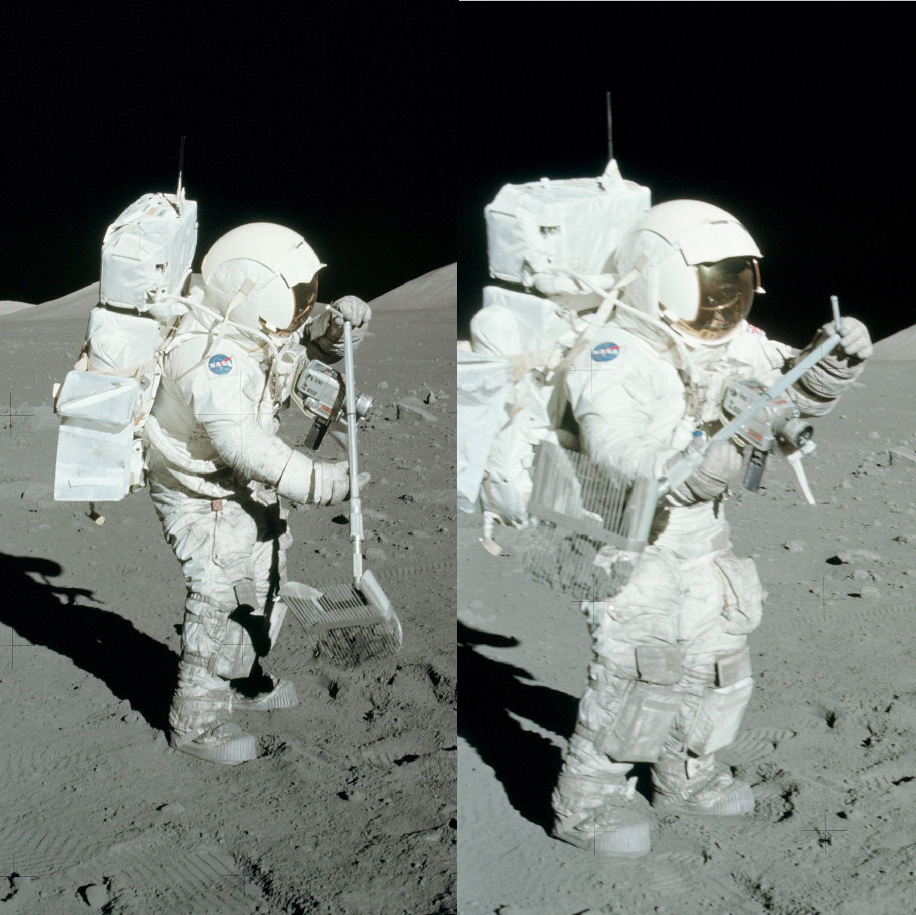 [Fendell pulls back on the zoom again and finds Jack using the rake.]122:29:35 Cernan: Okay, fill it up. (Long Pause)