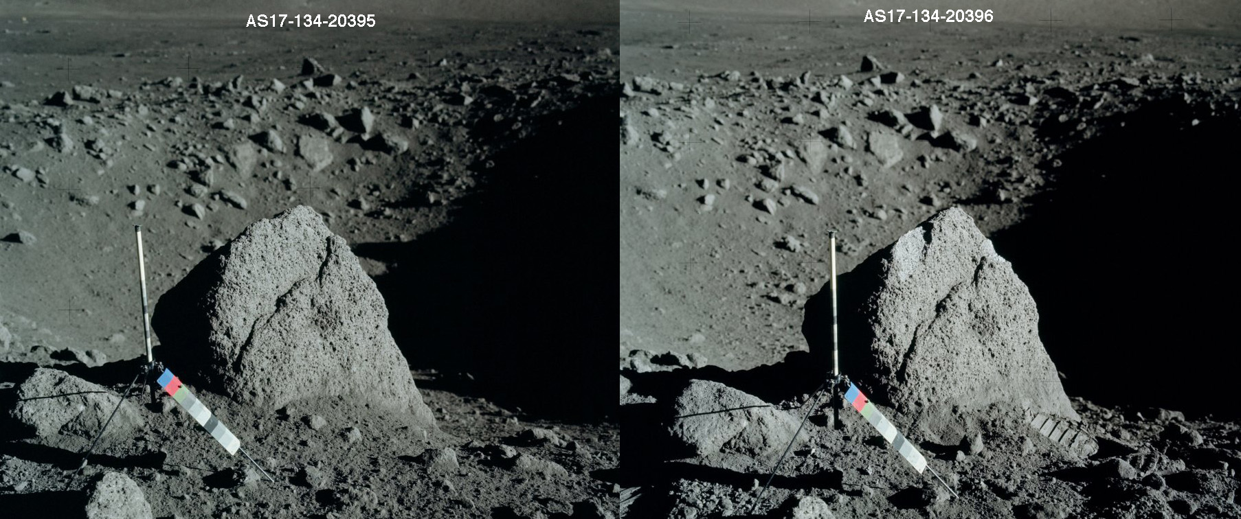 [Jack is photographing the sunlit face of the rock that they are about to sample. Gene, who is about to take a cross-Sun stereopair from south of the boulder, is reminding Jack not to get his shadow on the rock. On the site map, this boulder is at about 7 o'clock on the crater rim, relative to a 12 o'clock north. Gene's cross-Sun stereopair is AS17-134- 20394 and 20395 and Jack's down-Sun is AS17-136- 20739. Gene's photos show the crater quite well.]122:10:22 Schmitt: ...that's the down-Sun. (Pause) Ooh, locator's right into the Sun. Okay.