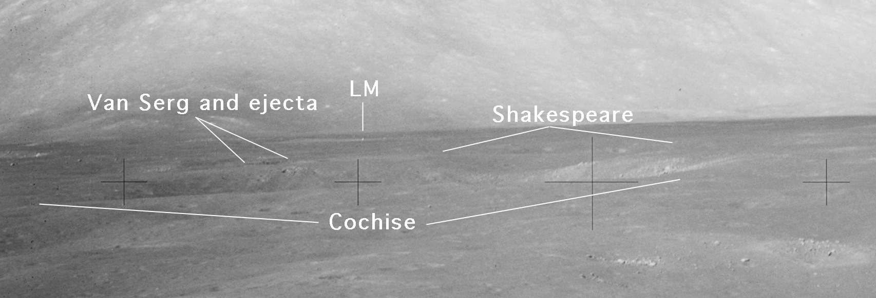 [Jacks traverse photos are AS17-142- 21671 to 21691. Frame 21674 is a photo of the "big mamoos". Mamoos is slang for breasts.]166:33:32 Schmitt: (Laughs) And it looks like they're probably the same thing that we sampled. They have the inclusions in them, white inclusions. They look like a mixture of the gray of the re-crystallized breccia, and the tan-gray of the anorthositic gabbro. (Pause) That must...Hey, look! There's Van Serg. Blocky-rimmed crater. That's the other side of Cochise there. See it?