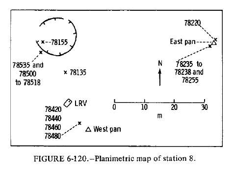 [Schmitt - "The other guys may have just had the EVA map with the traverse on it. And you (Gene) said, 'Why don't we put that in the cuff checklist.' It wouldn't surprise me."]166:32:09 Schmitt: Sure hard to tell where north is on it, though. (Pause)[This conjecture is correct. Neither the Apollo 15 nor 16 cuff checklists contained traverse maps.]