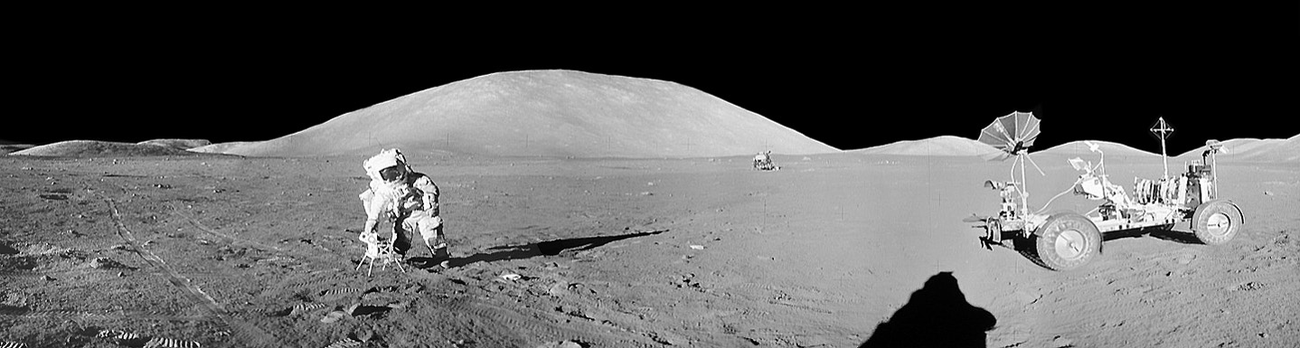 [Jack gave Bob a frame count of 95 when they were about to leave Station 1 at 122:33:08. He had just taken frame AS17-136-20776. That implies that Jack 'more or less' completed the pan with 20827. An examination of the frames suggests that Gene started driving off in a northwesterly direction after Jack took 20828. A comparison of details 20828 and 20813 ( 391k ) indicates that 20828 was taken from a spot a bit farther north than 20813 but along much the same line-of-sight. In 20828, the Rover tracks laid down after Jack took 20813 are off-camera to the right.]122:44:12 Schmitt: Bob, you know, the more I look at this - (To Gene) watch out for those babies there - at this dark dust, if you will, the more it doesn't seem like the kind of thing you'd expect to have been derived from the underlying bedrock. But I think you're going to have to play that game in the lab right now.[The LRV pan is presented as a PDF document ( 12 Mb ) and as a stitched panorama using only the upper right portion of each image, except 20815 ( 4 Mb ).]