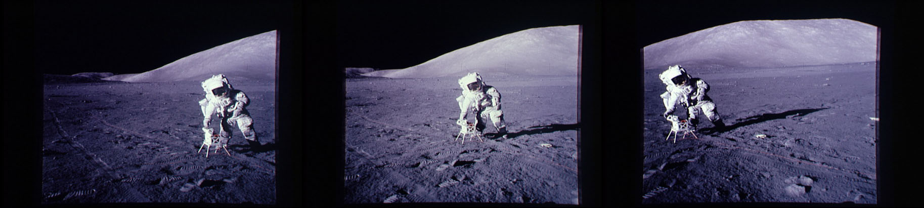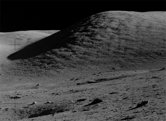 [Fendell is panning the TV and finds both of them at Gene's Rover seat; they leave the field-of-view before Fendell can stop the camera. With the astronauts out of the way, Fendell gets a good view of the shadowing on the Sculptured Hills.]123:08:46 Cernan: Just like the cover of the...[Cernan - "I could tear the tape with my hands. For some reason, this is one of the things I still remember clearly after nearly twenty years."]