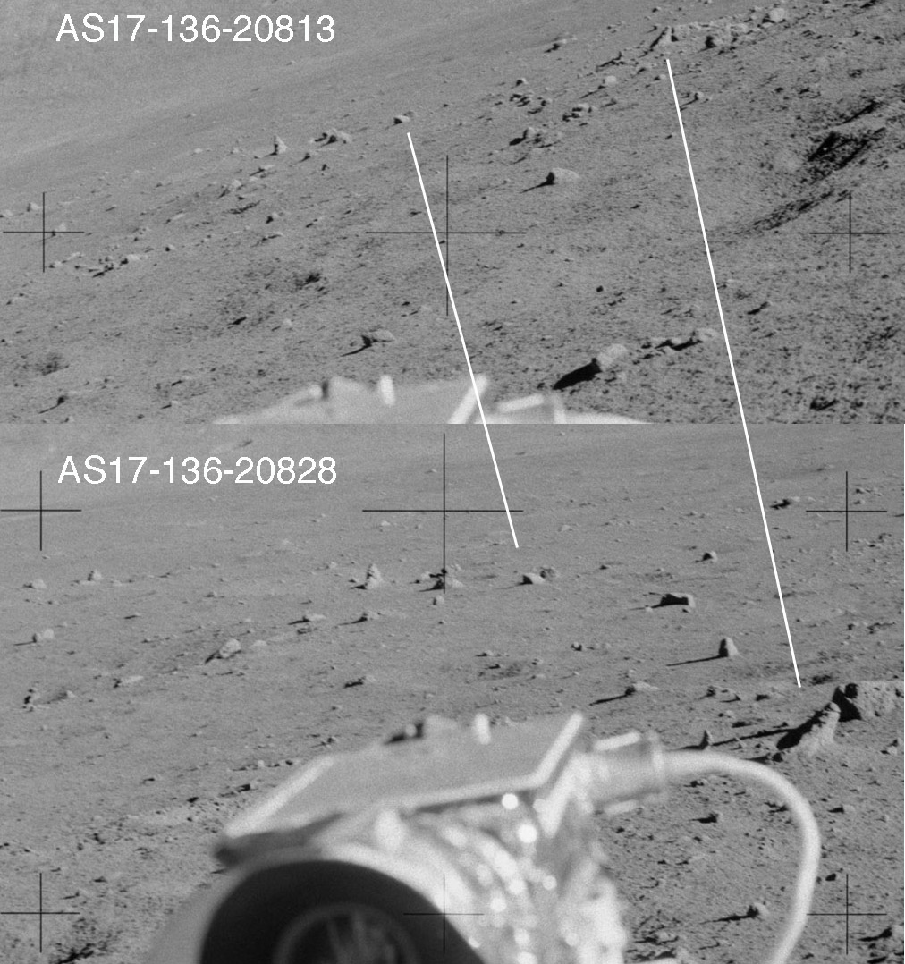 122:39:53 Schmitt: Not the one on the (boulder) track but the one over there to the right of that. (Pause) Unless the one with the track...I've got mixed emotions (as to) which is 6.