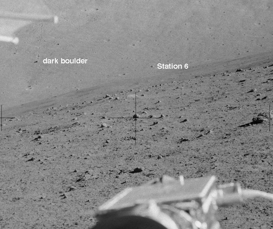 [In a labeled detail from AS17-136-20795 the dark boulder is on the left and the Station 6 boulder is on the right.]122:39:50 Cernan: I think you may be right. There's that boulder. I just want to get up here where I can (garbled)...