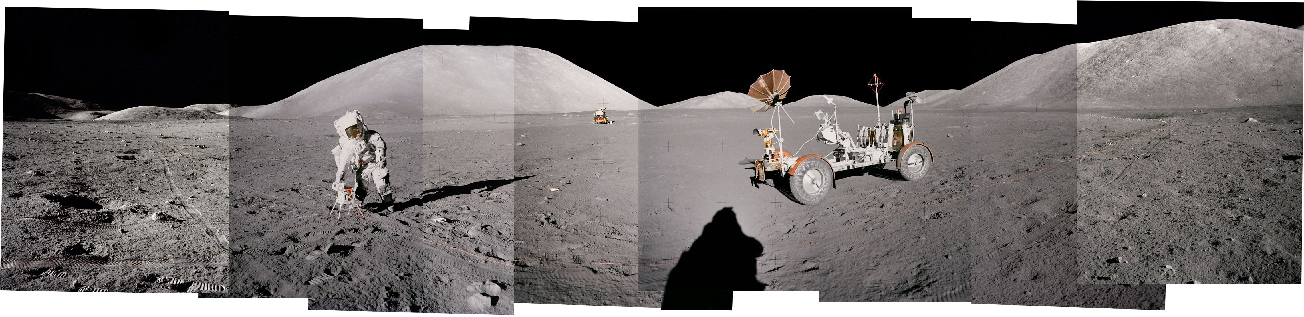 [Fendell finishes his pan and returns his attention to the transmitter. The solar panels are now open; the tape seems to be along the top.]123:11:02 Cernan: Jack, looking where the LM is, if I were you, I'd just walk down.