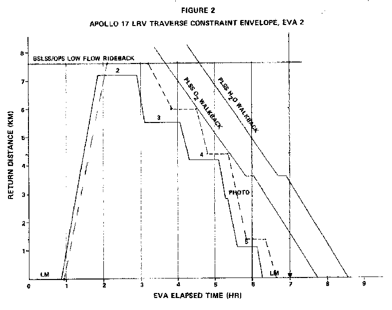 [They are now about 3 hours 50 minutes into the EVA. As indicated on CDR-15 ( 29k), they had planned to arrive at 3:19. A figure from an EVA-2 planning document by P.E. Reynolds of Bell Labs ( 50k ) shows the planned Return Distances and EVA Elapsed Times at various stages in the EVA. I have added the data for the actual EVA as dashed lines. The PLSS O2 and H2O walkback limits are shown as diagonal lines on the righthand side and, as they arrive at Station 3, they will have to leave again in no more than about 42 minutes because of walkback. As indicated in CDR-15 ( 29k), they had planned to spend 45 minutes at Station 3. Note that the drive from Station 2 to Station 3 has taken longer than assumed by Reynolds, primarily because of the Scarp Gravimeter stop. Note, also, that the actual return distances from the various stations are greater than those assumed in planning because Gene landed east of his target point to avoid Geophone Rock.]144:25:31 Parker: Okay. And, Jack, an update for you. We're going to want you to do some documented sampling on your own. I'll get with you guys on the rest of the station plan, shortly. Go ahead, Gene, we're ready.