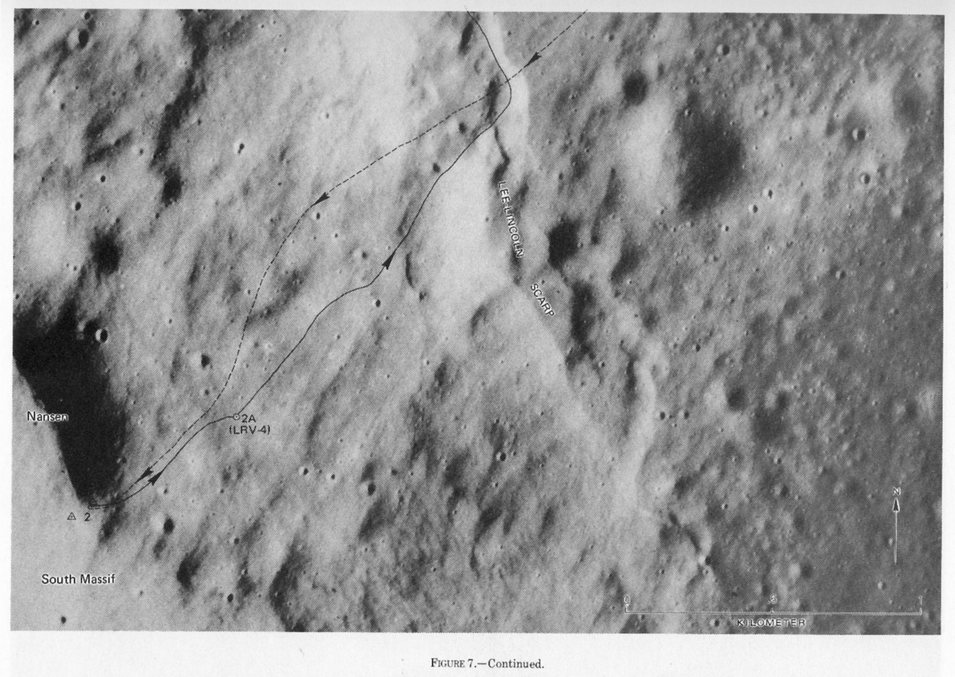[The planned Rover sample stop is not shown on the checklist map on LMP/CDR-14 but, rather, on the list of traverse tasks on LMP/CDR-15. AS17-138- 21075 and 21076 are taken during the next minute or so.]143:50:03 Cernan: Bob, we're on the top, coming off the highest lobe of the Scarp looking back into the valley. And it's quite a scene back there, but we still cannot see the LM. (Pause) That may be it. I don't know.