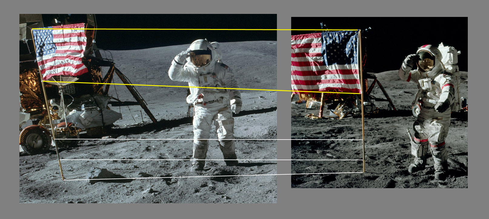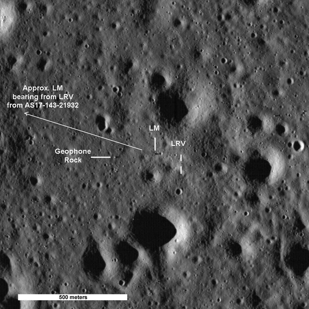 | Animation made from seven LROC images of the Apollo 17 landing site, ordered from sunrise to sunset, and showing the changing length and location of the shadow cast by the U.S. flag erected by the crew. The frames are: (1) M116113215RC, Sun 8 degrees above the eastern horizon; (2) M131447374LC , 11 deg. east; (3) M129086118LC , 35 deg. east; (4) M109032389LC , 68 deg. east; (5) M134985003RC , 26 deg. west; and (6) M117291316LC , 5 deg. west. LROC images courtesy NASA/GSFC/Arizona State University. |