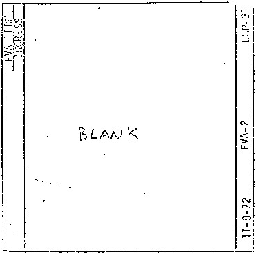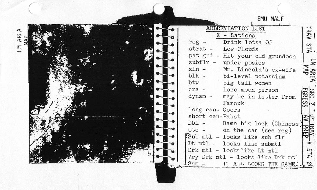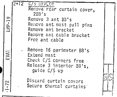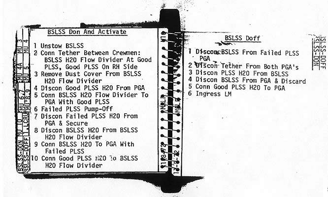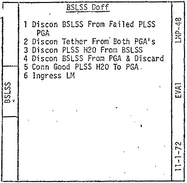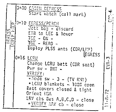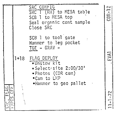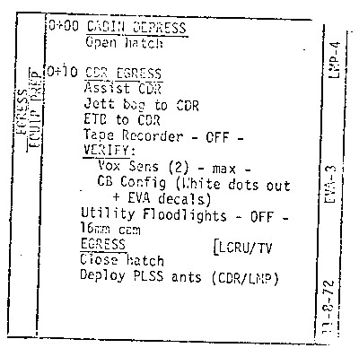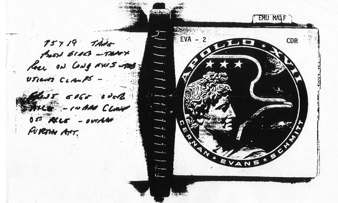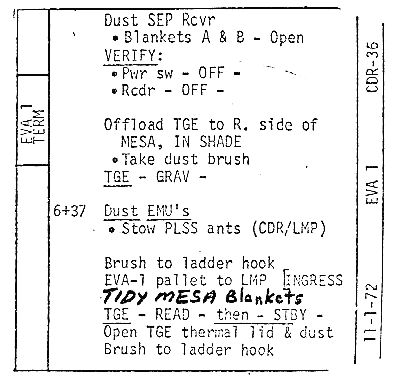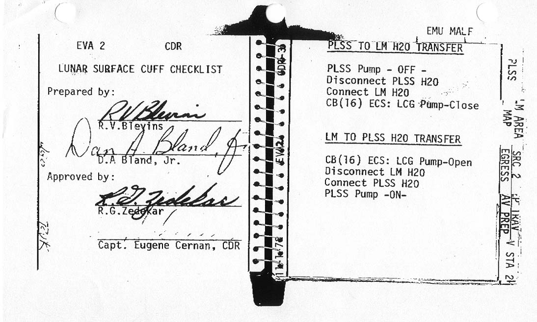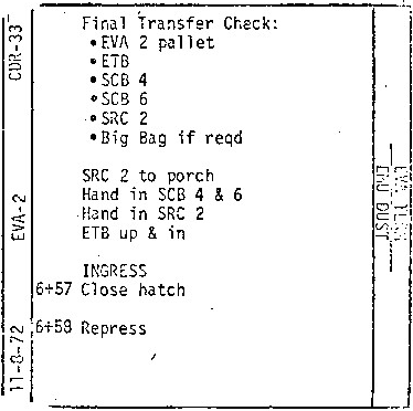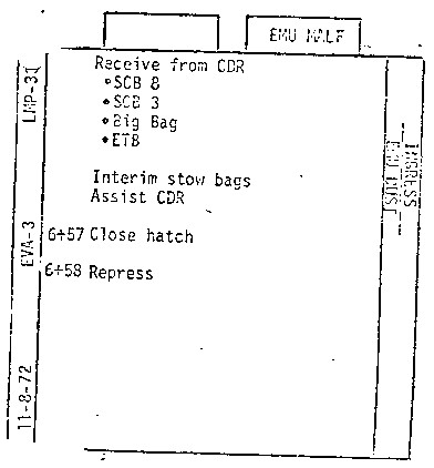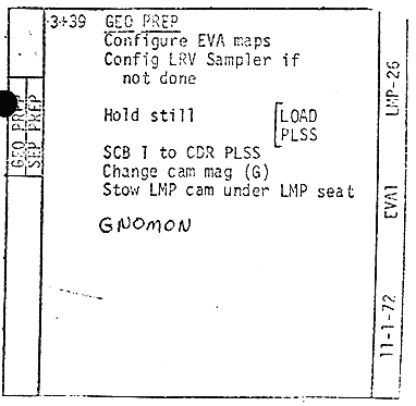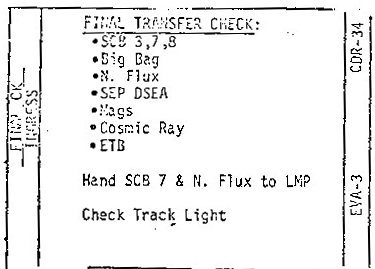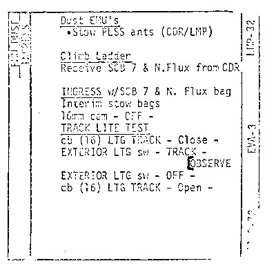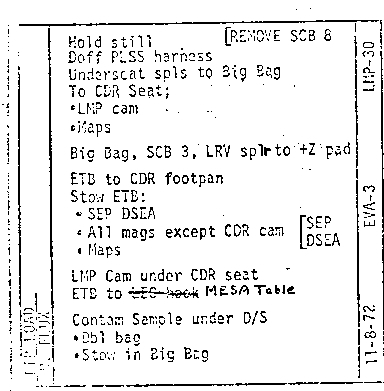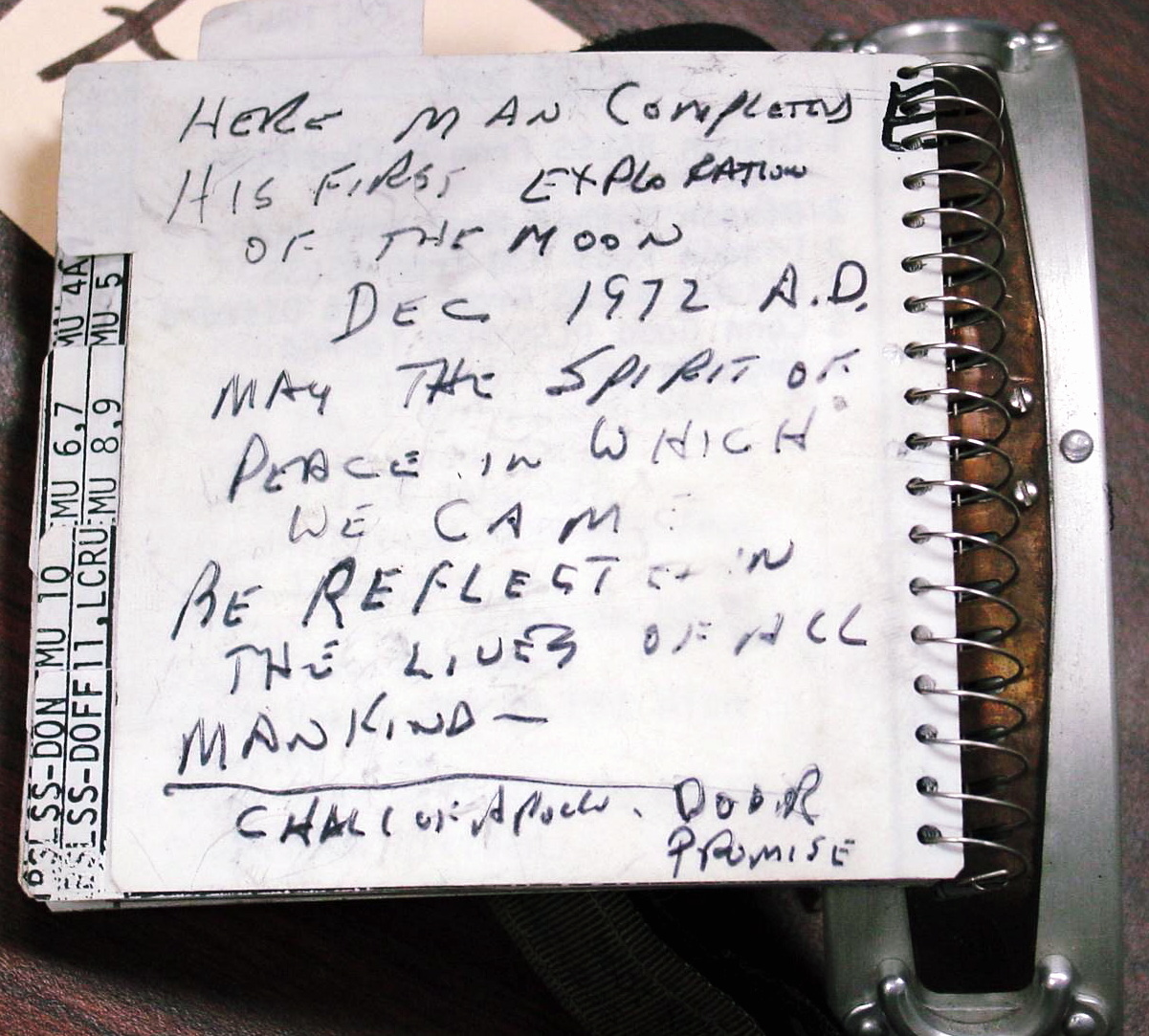 Gene wrote this note on the back of his EVA-3 cuff checklist before the prior rest period. It is a 'tickler' to remind him of what he wanted to say prior to climbing the ladder for the last time. Above the line is the text of the plaque afixed to the ladder and, below the line, the words "Chall(enge) of Apollo. Door Promise." See the transcript and discussion following 170:41:00. Photograph of the flown checklist page taken by Larry McGlynn at the Kansas Cosmosphere in 2000.