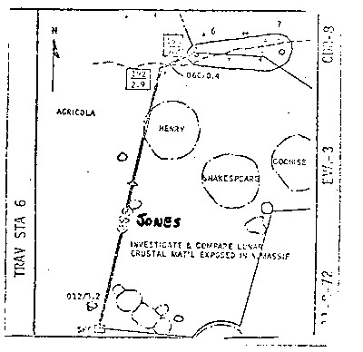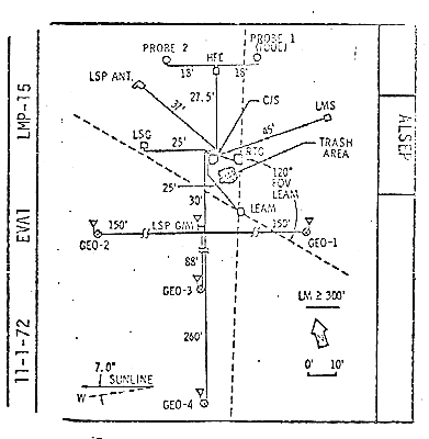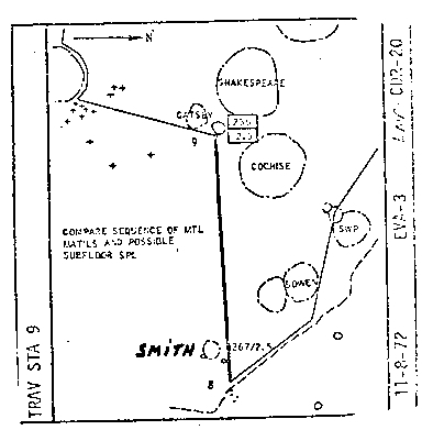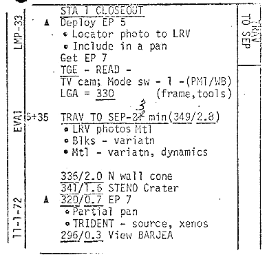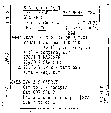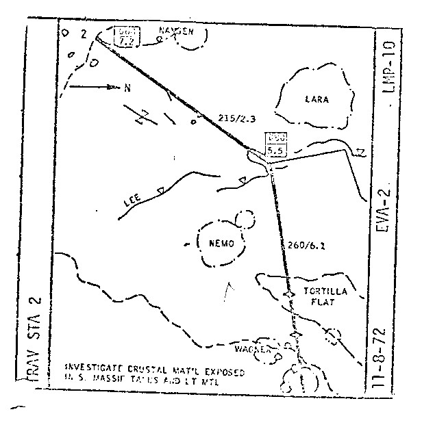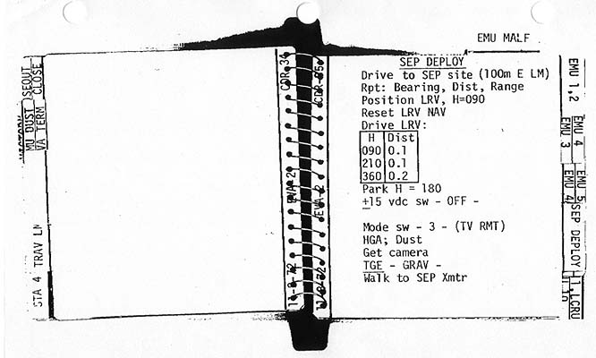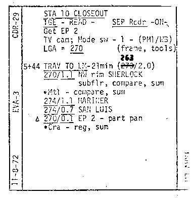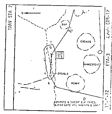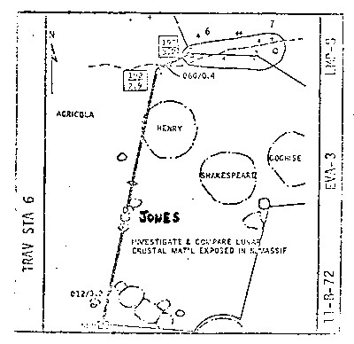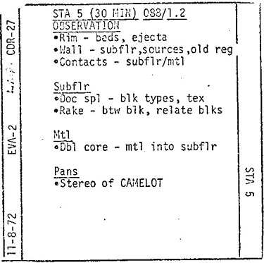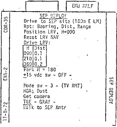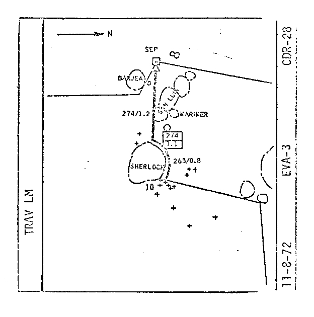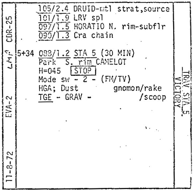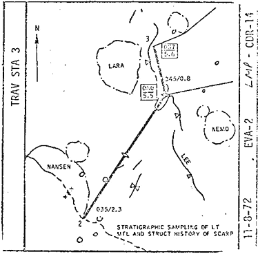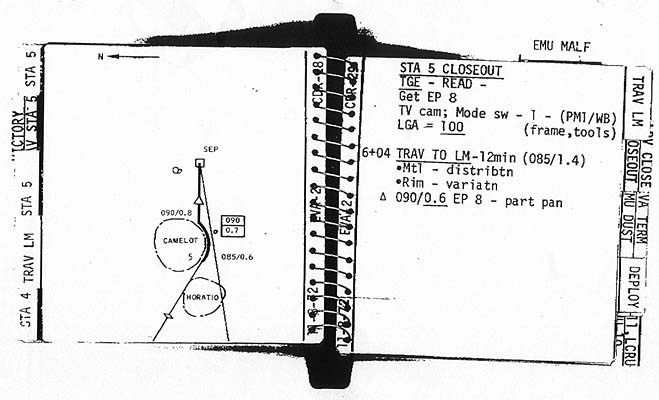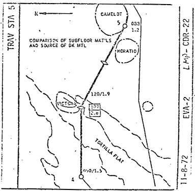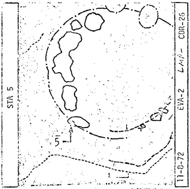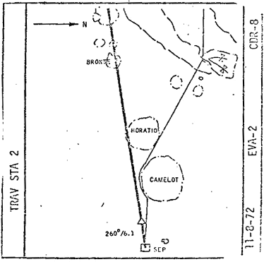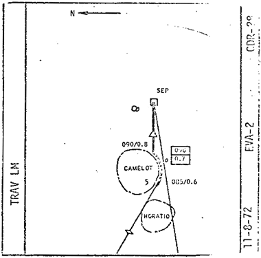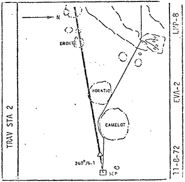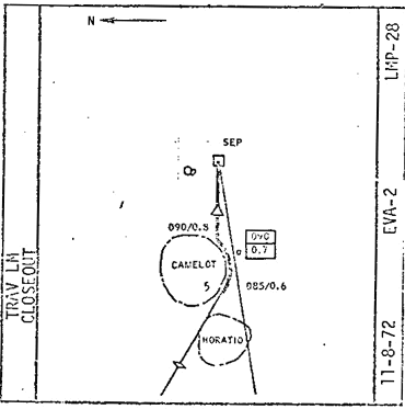 Station 5 to LM Traverse Map. The planned SEP bearing/range at the east rim of Camelot is 090/0.7. Because Gene landed east of his target, the actual values differ slightly from these planning values. The unboxed number pairs indicate the planned heading and distance for each traverse segment.LMP-29A
