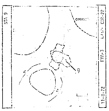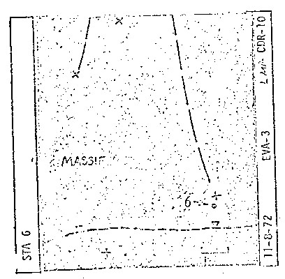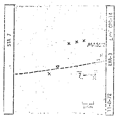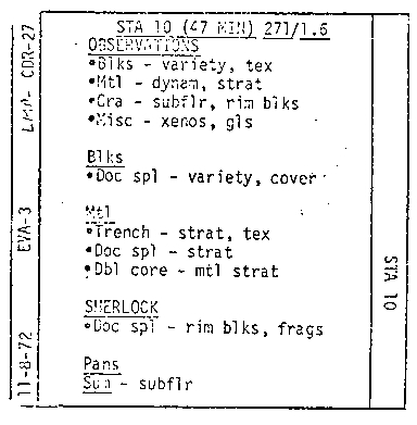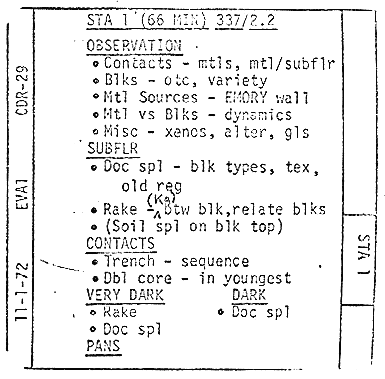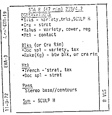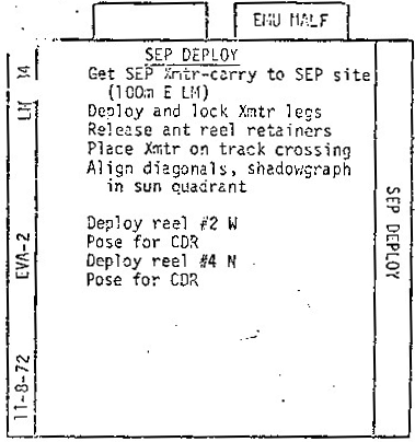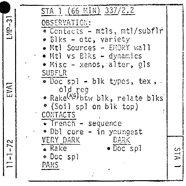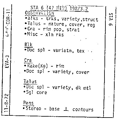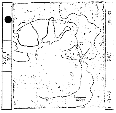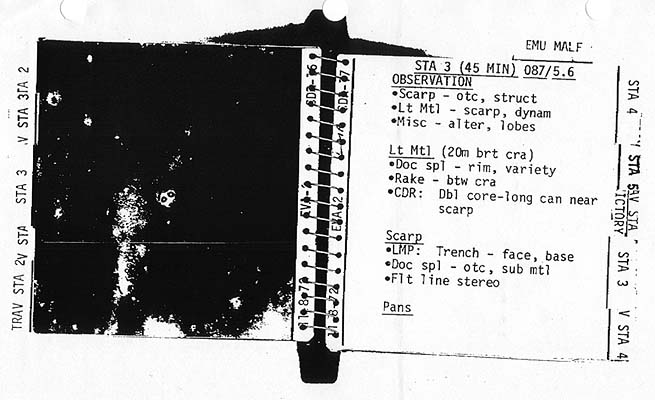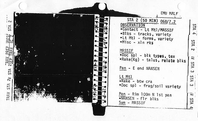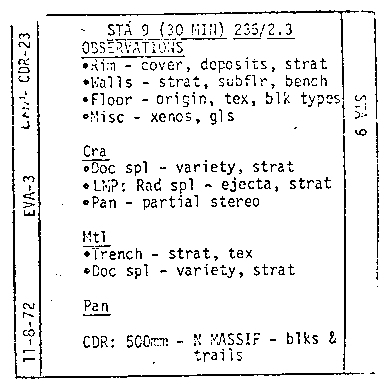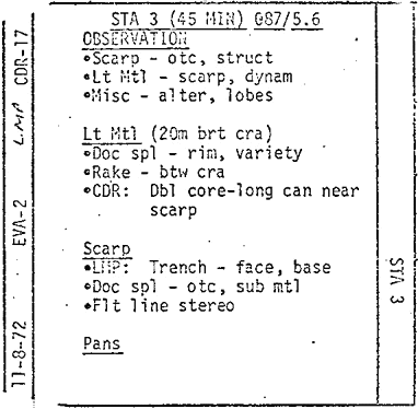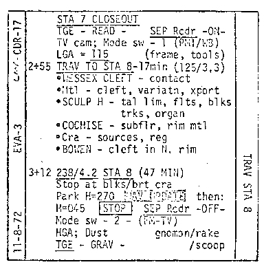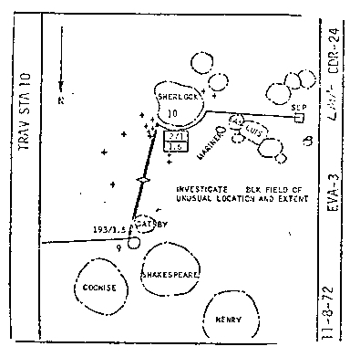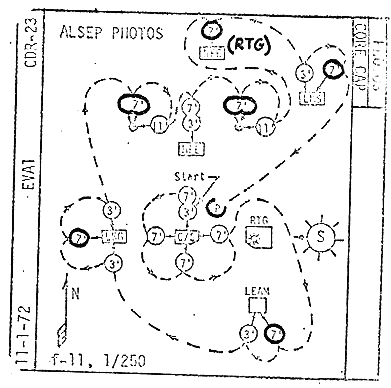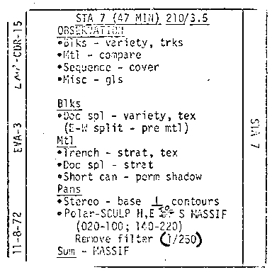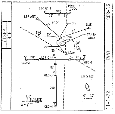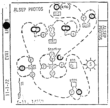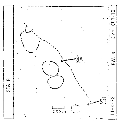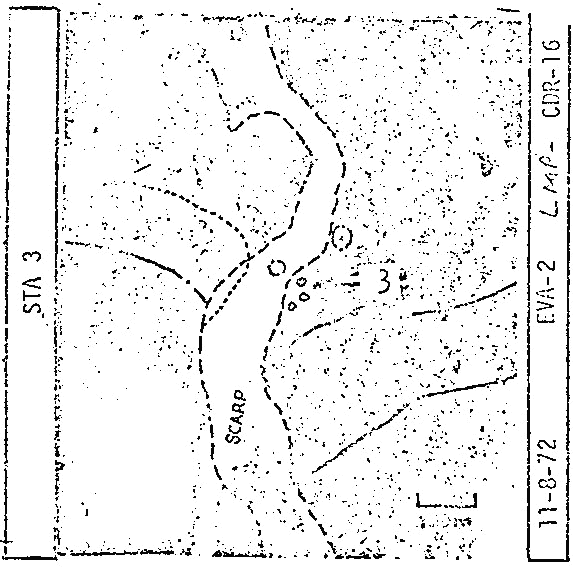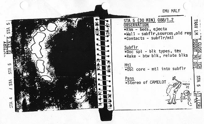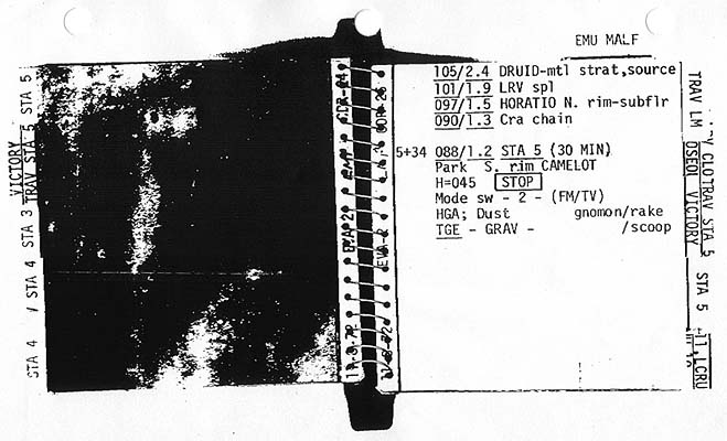 Station 5 to LM Traverse Map. The planned SEP bearing/range at the east rim of Camelot is 090/0.7. Because Gene landed east of his target, the actual values differ slightly from these planning values. The unboxed number pairs indicate the planned heading and distance for each traverse segment.LMP-29A