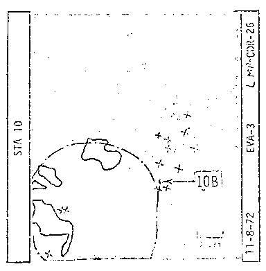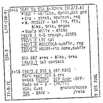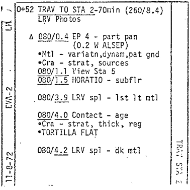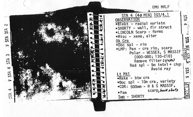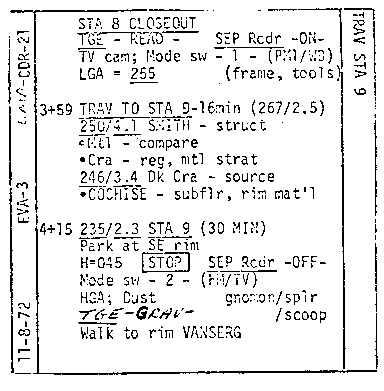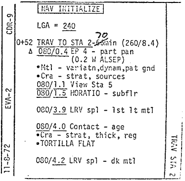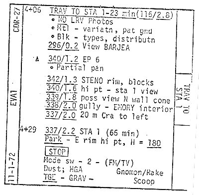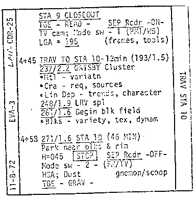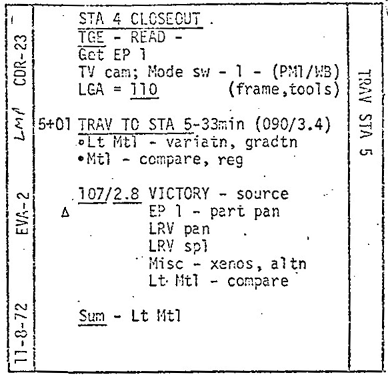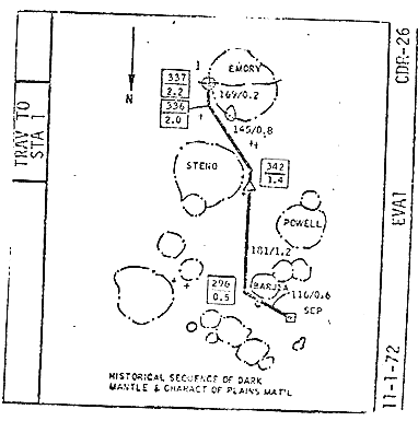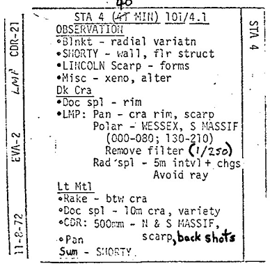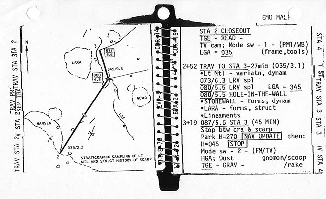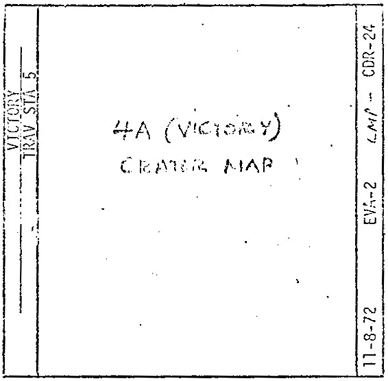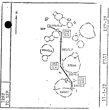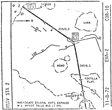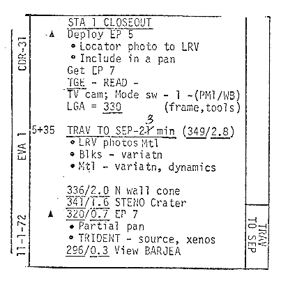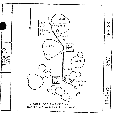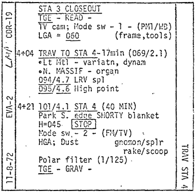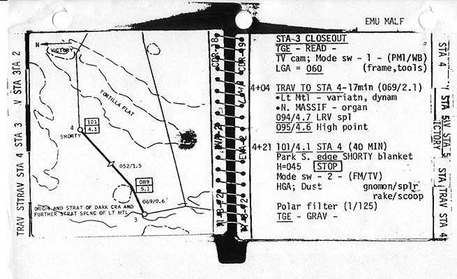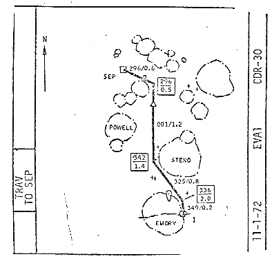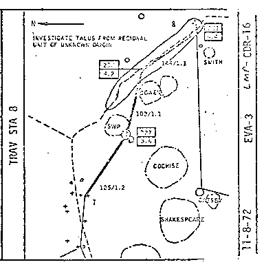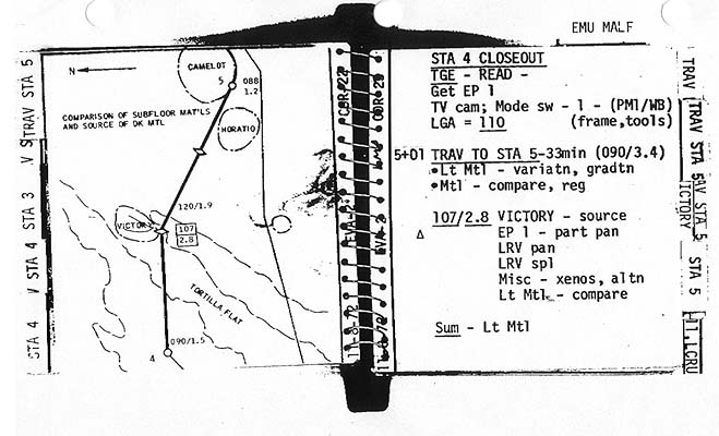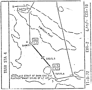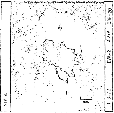 Traverse to Station 4 Map. The planned SEP bearing/range at the turning point at the unnamed crater on the route to Station 4 is 089/5.1 and at Station 4 is 101/4.1. Because Gene landed east of his target, the actual values differ slightly from these planning values. The unboxed number pairs indicate the planned heading and distance for each traverse segment.LMP-19