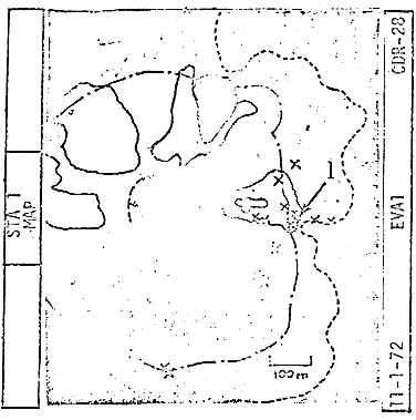 (Left) CDR-28 : Station 5 to LM Traverse Map. The planned SEP bearing/range at the east rim of Camelot is 090/0.7. Because Gene landed east of his target, the actual values differ slightly from these planning values. The unboxed number pairs indicate the planned heading and distance for each traverse segment.CDR-30/31(Right) CDR-29 : 6+04 Trav to LM