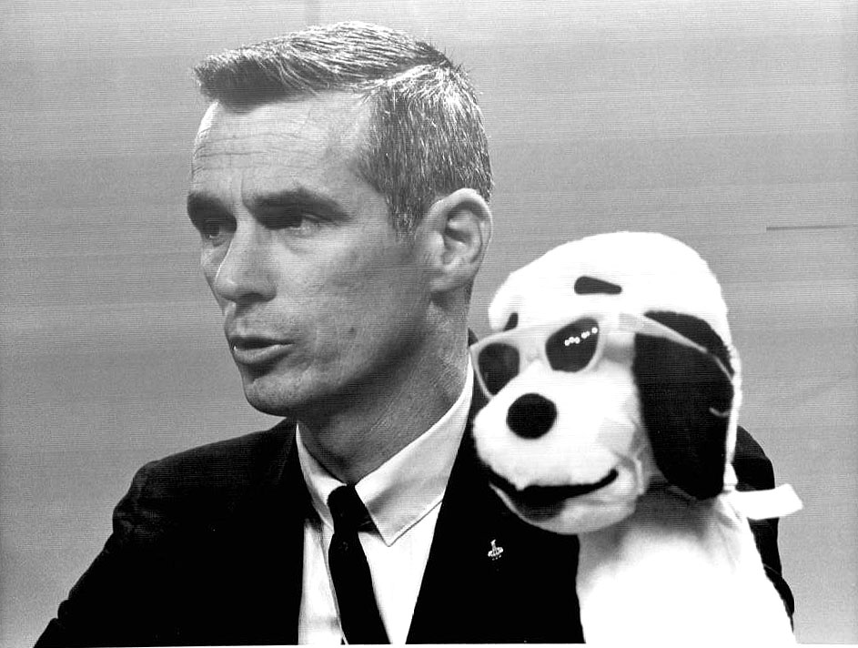 The Apollo 10 Lunar Module was nicknamed "Snoopy", after the character in the Charles Schulz comic strip "Peanuts". Here, we see LMP Gene Cernan at a 26 April 1969 news conference next to a Snoopy puppet.S69-32613 ( 100k )