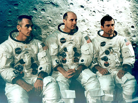 Apollo 10 crew portrait with LMP Gene Cernan at the left, CDR Tom Stafford in the center, and CMP John Young on the right. This was the first all-veteran crew to have flown a U.S. space mission.69-H-758 ( 128k or 1.0 Mb )
