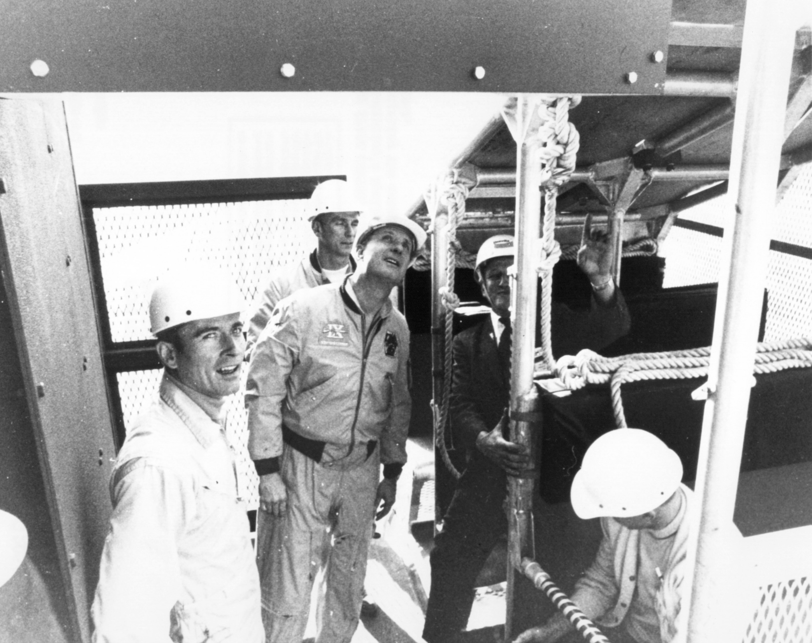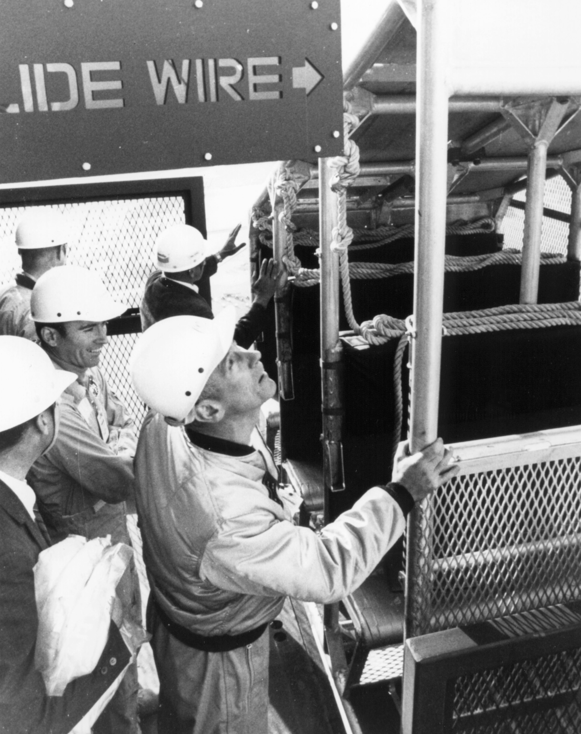 Tom Stafford (center), Gene Cernan (behind Stafford to the left), and John Young (left foreground) examine emergency escape equipment at Complex 39A. Image filed 27 March 1969. Scan by Ed Hengeveld69-H-575 ( 141k or 921k )