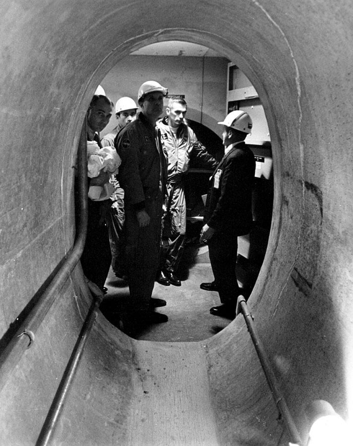 Tom Stafford (foreground), John Young (left center), and Gene Cernan (back left) examine emergency escape equipment at Complex 39A. Image filed 27 March 1969. Scan by Ed Hengeveld69-H-576 ( 137k or 1.0 Mb )