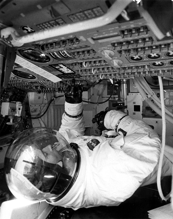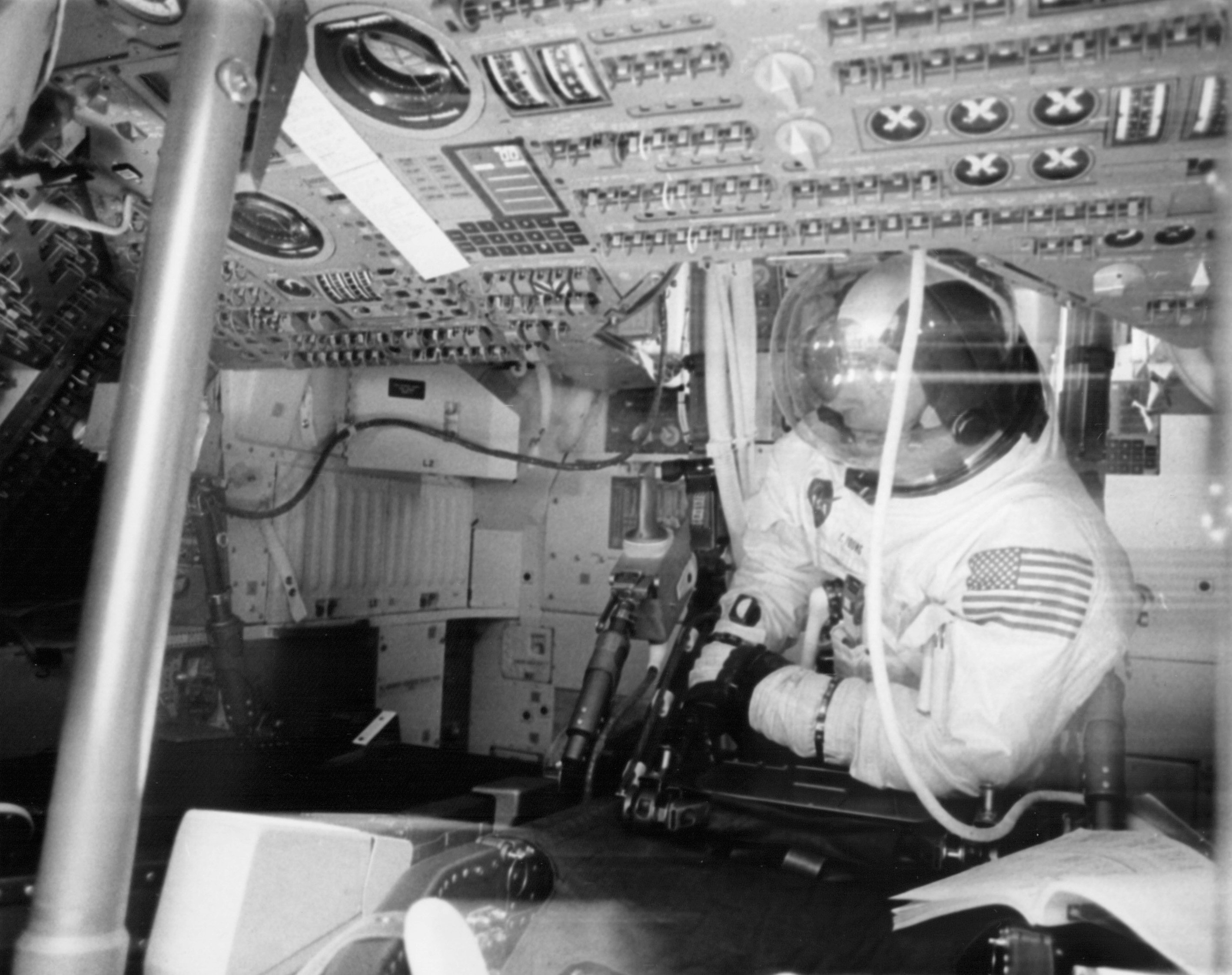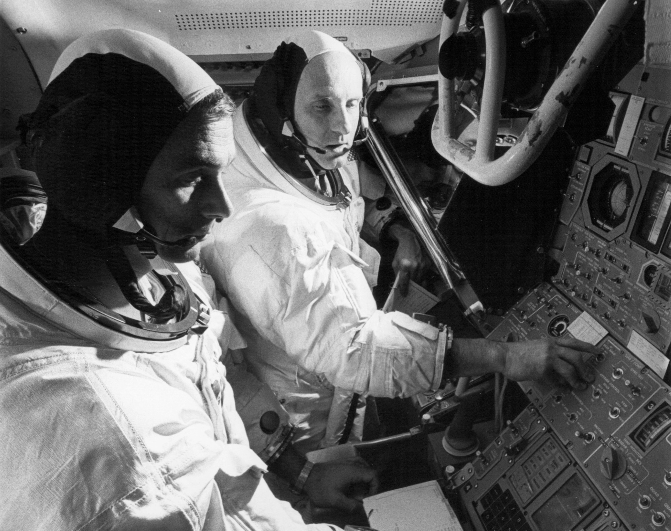Gene Cernan (left) and Tom Stafford in the LM simulator. Image filed 3 April 1969. Scan by Ed Hengeveld69-H-651 ( 122k or 0.8 Mb )