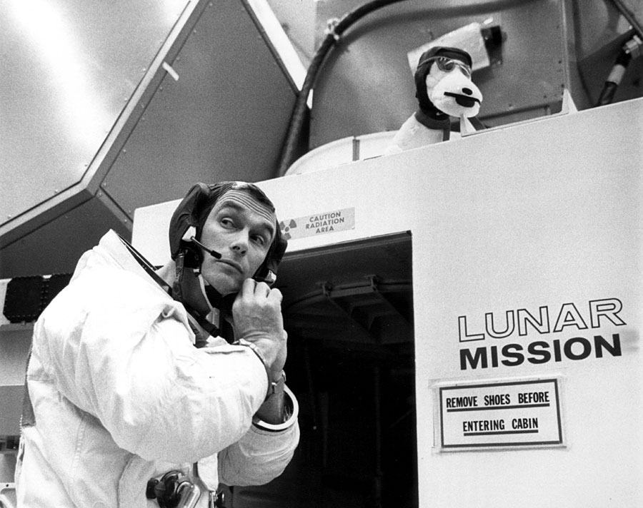 Gene Cernan prepares to enter the Lunar Module simulator. Note the Snoopy mascot above the door. Image filed 17 April 1969. Scan by Ed HengeveldS69-32037 ( 140k )