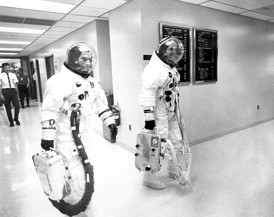 John Young (left) and Tom Stafford head for the elevator and the transfer van which will take Gene Cernan and them out to the pad for the Countdown Demonstration Test. Image filed 6 May 1969. Scan by Ed HengeveldS69-34145 ( 104k )