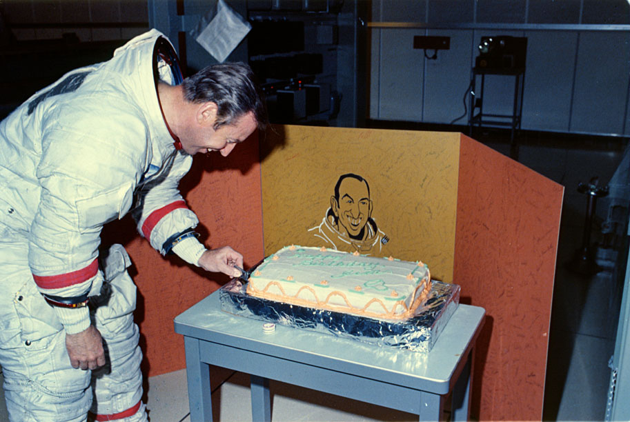 "During that evening in the photo lab ... a decision was made to include some sort of astronaut identification on future missions. It was Brian Duff who was partly responsible for the inclusion of stripes on the CDR's spacesuit on later missions - too late for Apollo 12. For 24 hours they were called the 'Public Affairs Stripes' before being renamed the 'Commander's Stripes'."The earliest photograph currently in the ALSJ collection showing CDR stripes on an Apollo suit is 70-HC-300, which was taken on 25 March 1970 and shows Jim Lovell with a birthday cake presented to him during a training exercise. The stripes are red, as they were on all the flown CDR suits from Apollo 13 onward. The suit he was wearing on 25 March was almost certainly his training suit. NASA photo S70-34848 shows Jim, wearing his flight suit, during suit-up for launch on 11 April 1970.