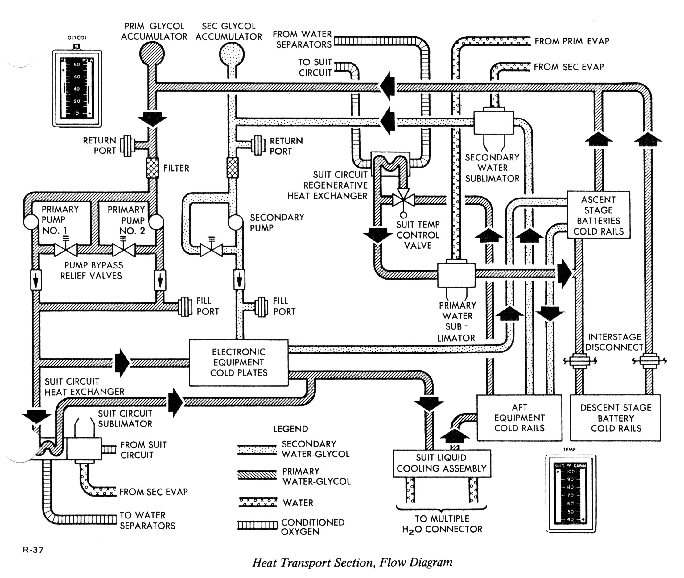 Coolant from the recirculation assembly flows into parallel paths that serve the upstream electronics cold plate group. In this group, the data storage electronics assembly (DSEA) is cooled by cold rails; the remainder of the electronics, by cold plates. The cold plates are in the pressurized and unpressurized areas of the LM. The flow rates through the parallel paths are controlled by flow restrictors, installed downstream of the cold plate group. The first upstream electronics flow path cools the suit circuit heat exchanger. The second flow path cools five cold plates mounted on the pressurized side of the equipment tunnel back wall. The third path serves the integrally cooled IMU and the rate gyro assembly (RGA) cold plate, both located in the unpressurized area (on the navigation base). The fourth path cools the abort sensor assembly (ASA) and pulse torque assembly (PTA) cold plates. All the plates for the fourth path are in the unpressurized area above the cabin; the ASA is on the navigation base of the alignment optical telescope (AOT). The fifth path serves the tracking light electronics (TLE), gimbal angle sequencing transformation assembly (GASTA), lighting control assembly (LCA), and DSEA plates: one in the unpressurized area in front of the cabin, a second one in the control and display panel area, a third one below the cabin floor, and another one on the left wall of the cabin.
