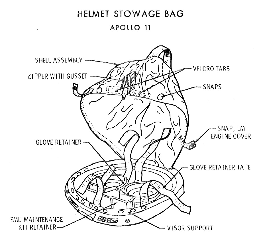 | Helmet stowage bags - containing LEVAs, gloves, etc - stowed on cabin floor | LM (Earth) Launch | A11 Stowage lists, List B, LM Launch Stowage List, page 41 |