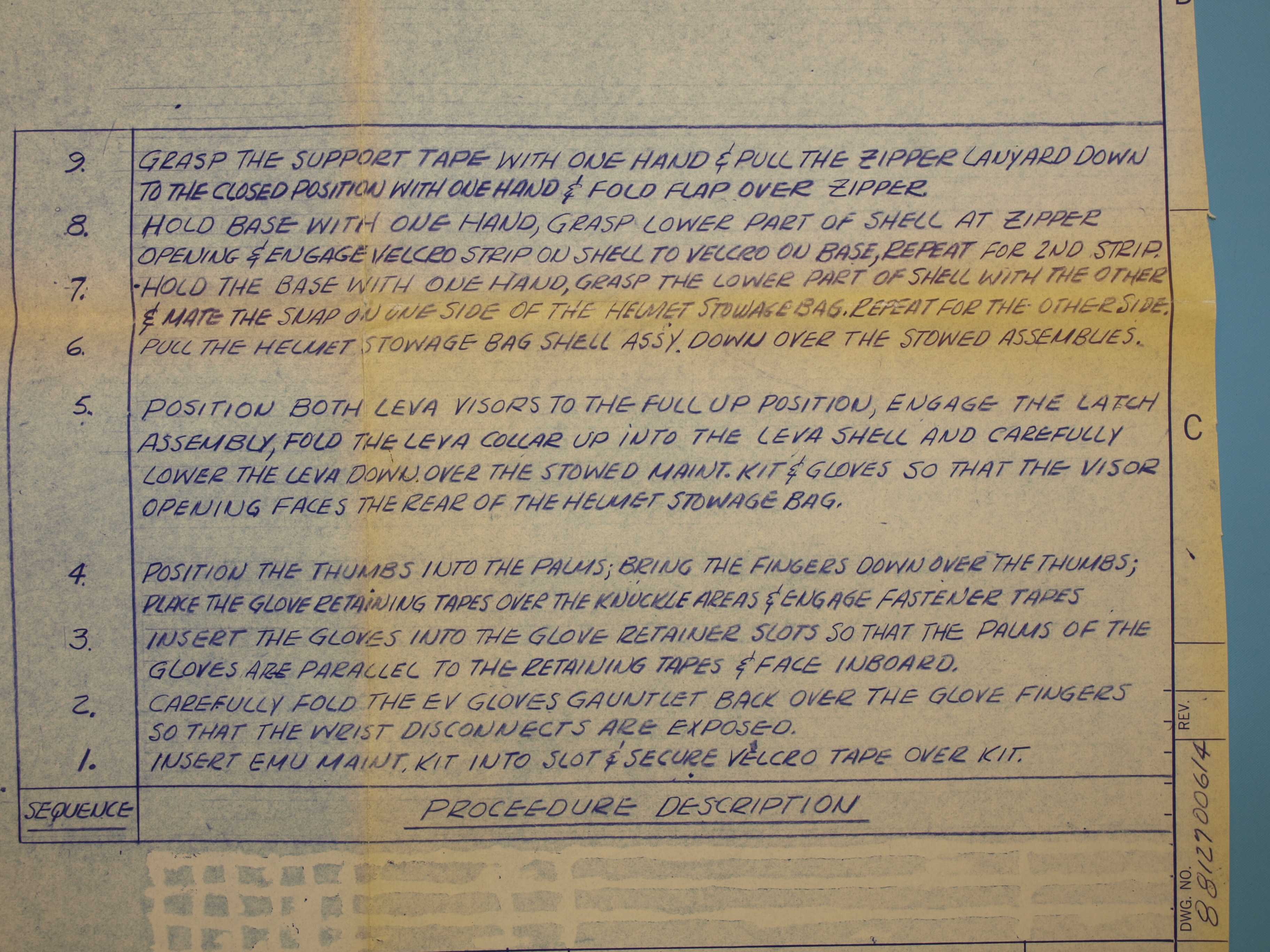 | "Doff gloves, stow on comm panel; Doff helmets with visors, stow in helmet bag (HLISCA)" | Post-SEVA Systems Configuration |