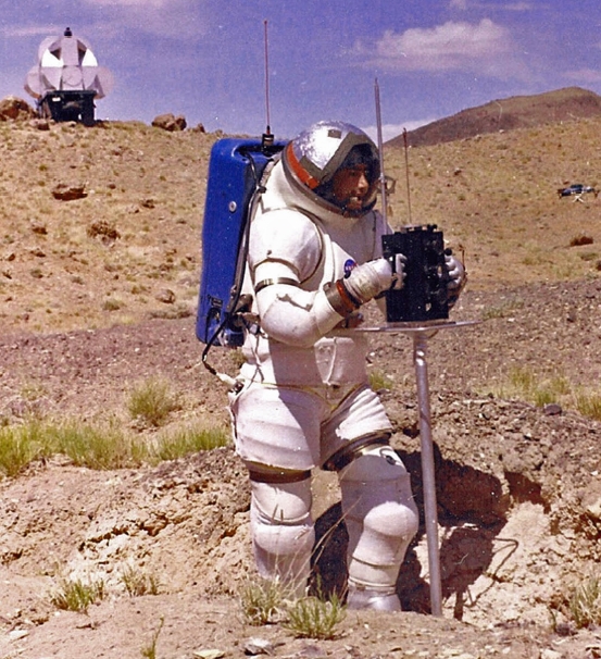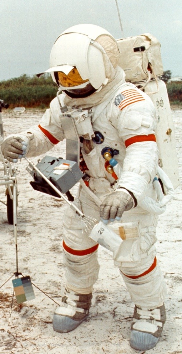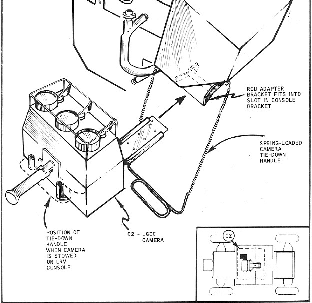 I became interested in this camera system when I first saw it in two photographs of the Apollo 14 crew during EVA training. These two photographs, namely AP14-70-H-1305 and AP14-S70-46157, shown below (cropped), show Commander Alan Sheppard with the camera mounted to the Remote Control Unit on his EMU. where one would normally expect to see a Hasselblad ELP camera.