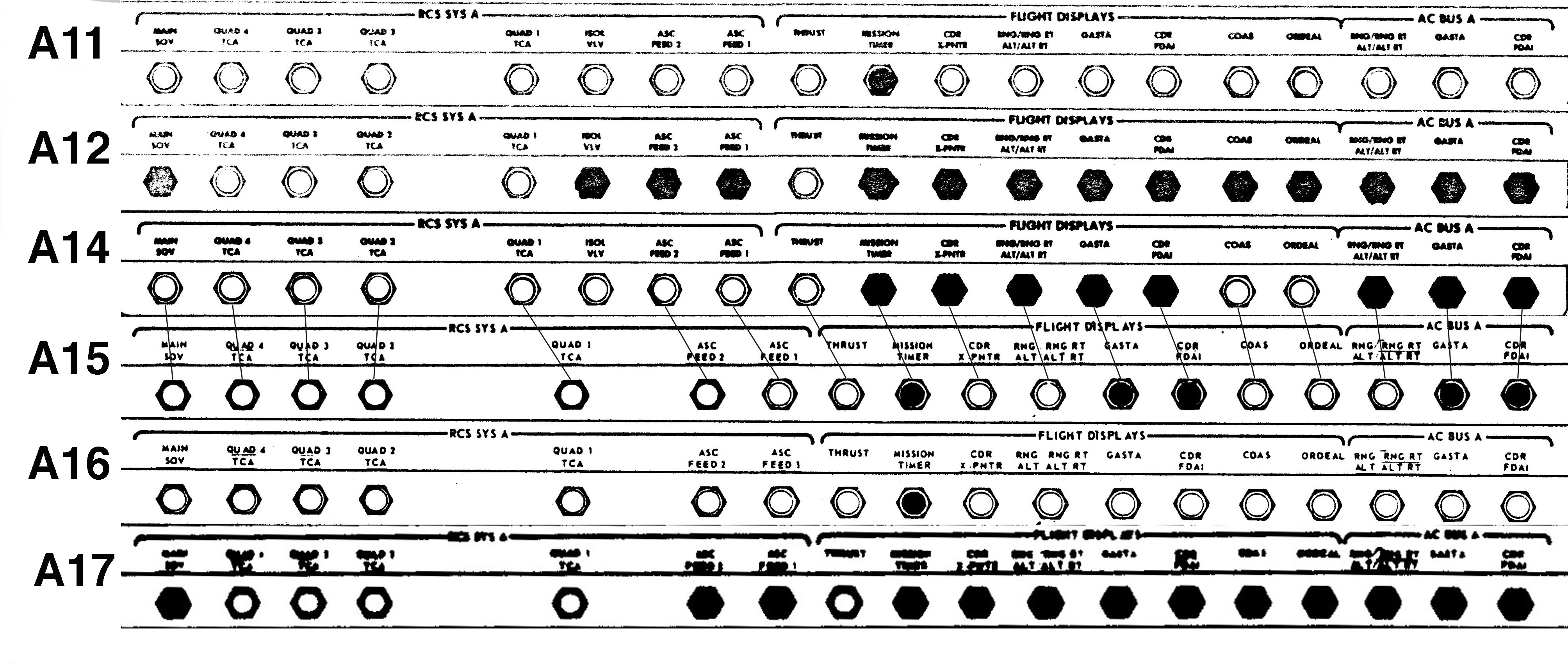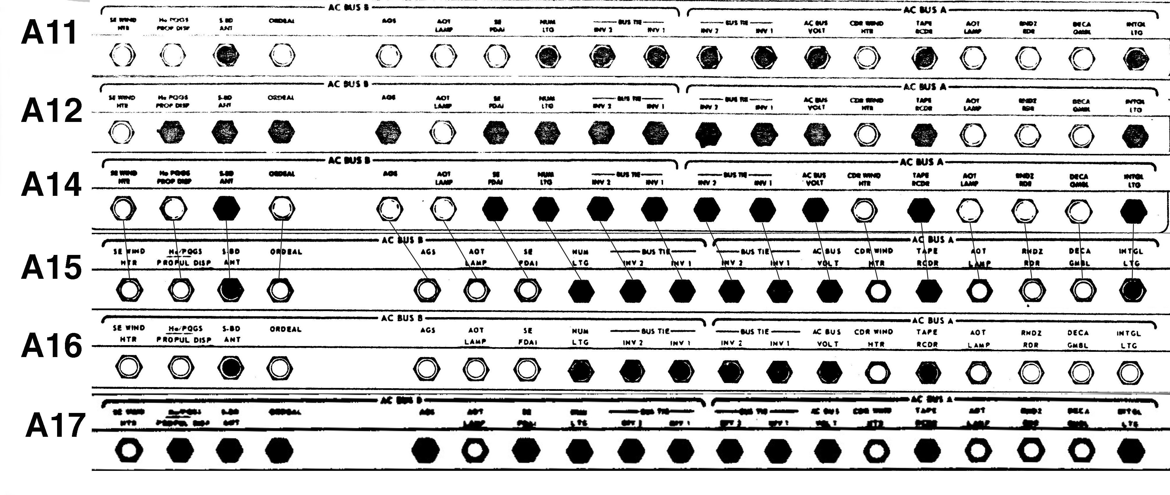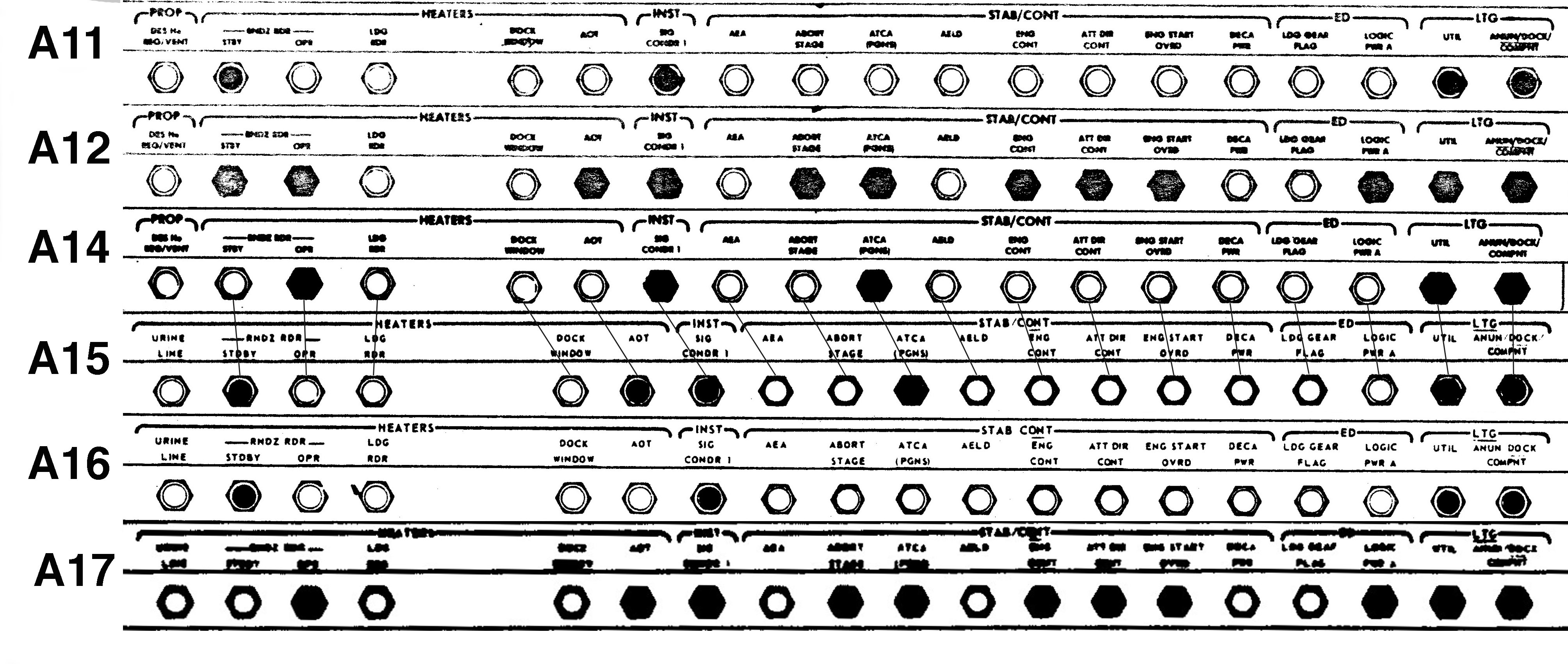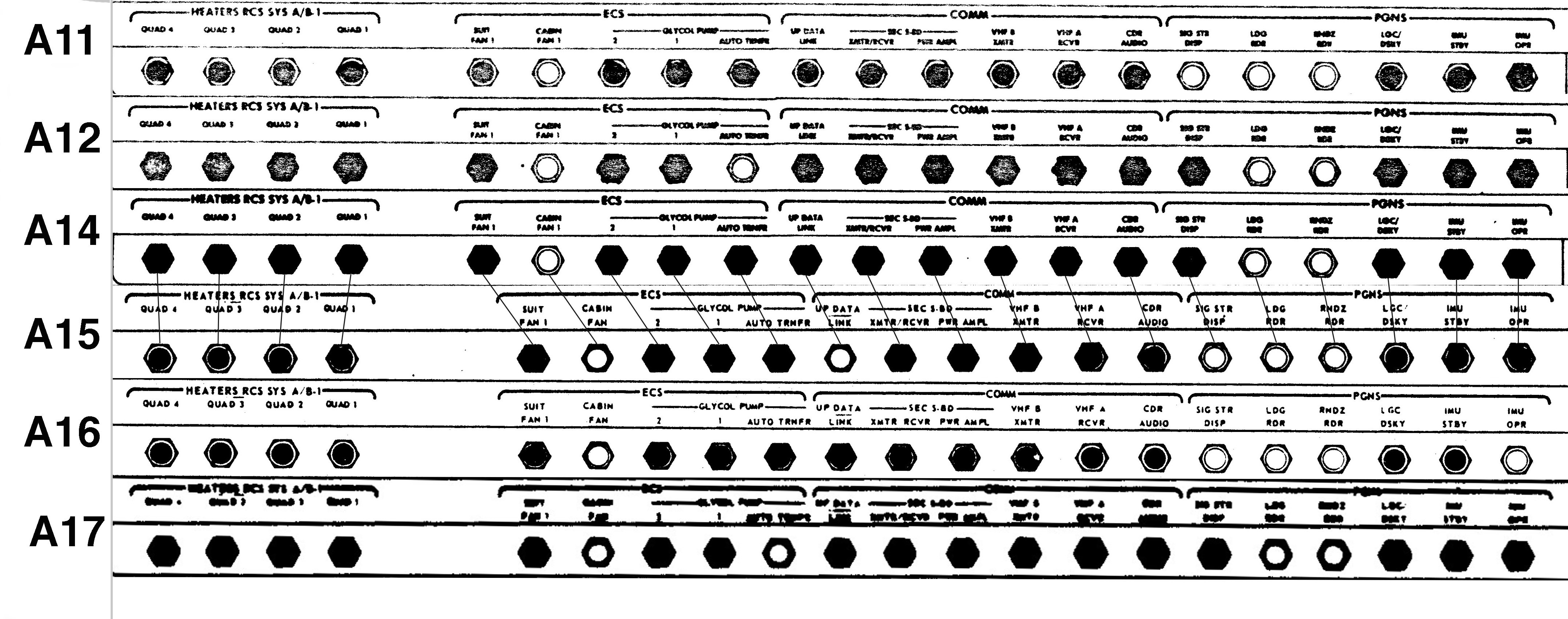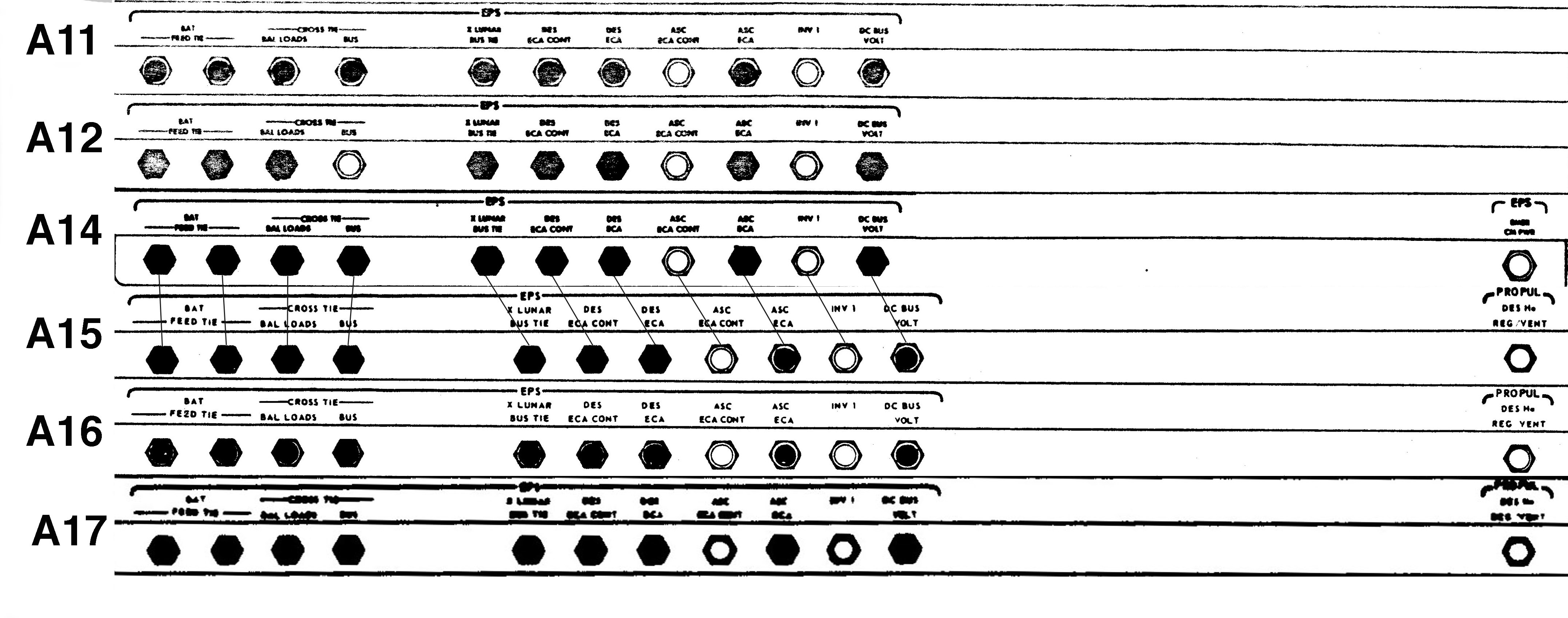 In the following sections, we consider the rows of breakers one at a time and compare the configurations for the six landing missions. Note that these configurations were taken from the LM Lunar Surface Checklists for the various missions. Breakers represented by completely black circles were to be closed while breakers represented by circles with white centers were to be open. The diagrams for the various missions are not necessarily from the same mission phase, so the fact that a breaker is black or white is not important to the comparison.