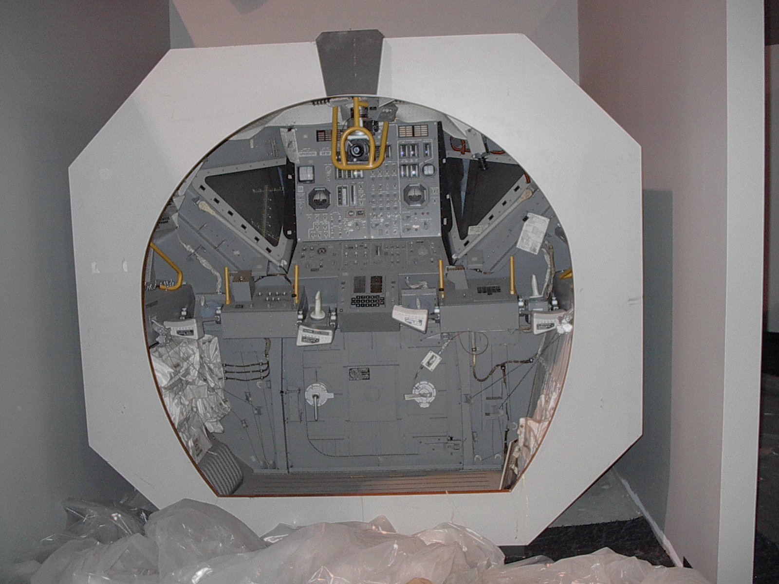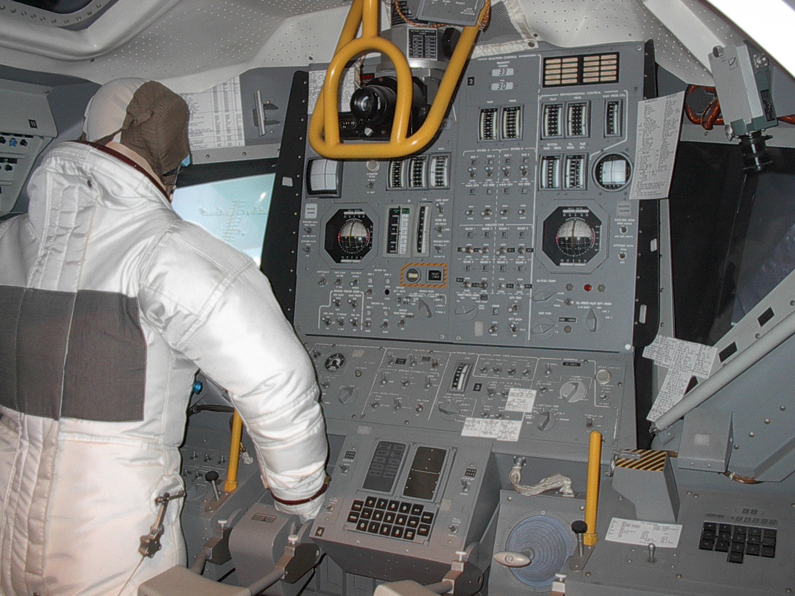 Frank O'Brien writes: "In one of the history books (I forget which one), they talk about how good Grumman was in building cockpit mockups. Apparently, they were masters at the art. I am of the belief that these are pictures of a cockpit mockup, that was used for crew 'fit and function' evaluation. My argument for this being a 'cockpit evaluation mockup', contrasted with a 'procedures trainer' is that the layout is quite old - many of the side panels are empty or completely different from those in the flown LMs. The DSKY and DEDA are dummies - you can't even press the buttons. I can't think of many things that you would do without that capability. Finally, and most importantly, it looks perfectly brand-new. Absolutely no wear anywhere. Contrast that with the LM simulator, which is, frankly, beaten to death. Josh Stoff, the curator at Cradle of Aviation Museum, swears that it is a procedures trainer; and we've agreed to disagree. I guess that's life. It would be my guess that this cockpit layout reflected the best thinking in 1967 or so."