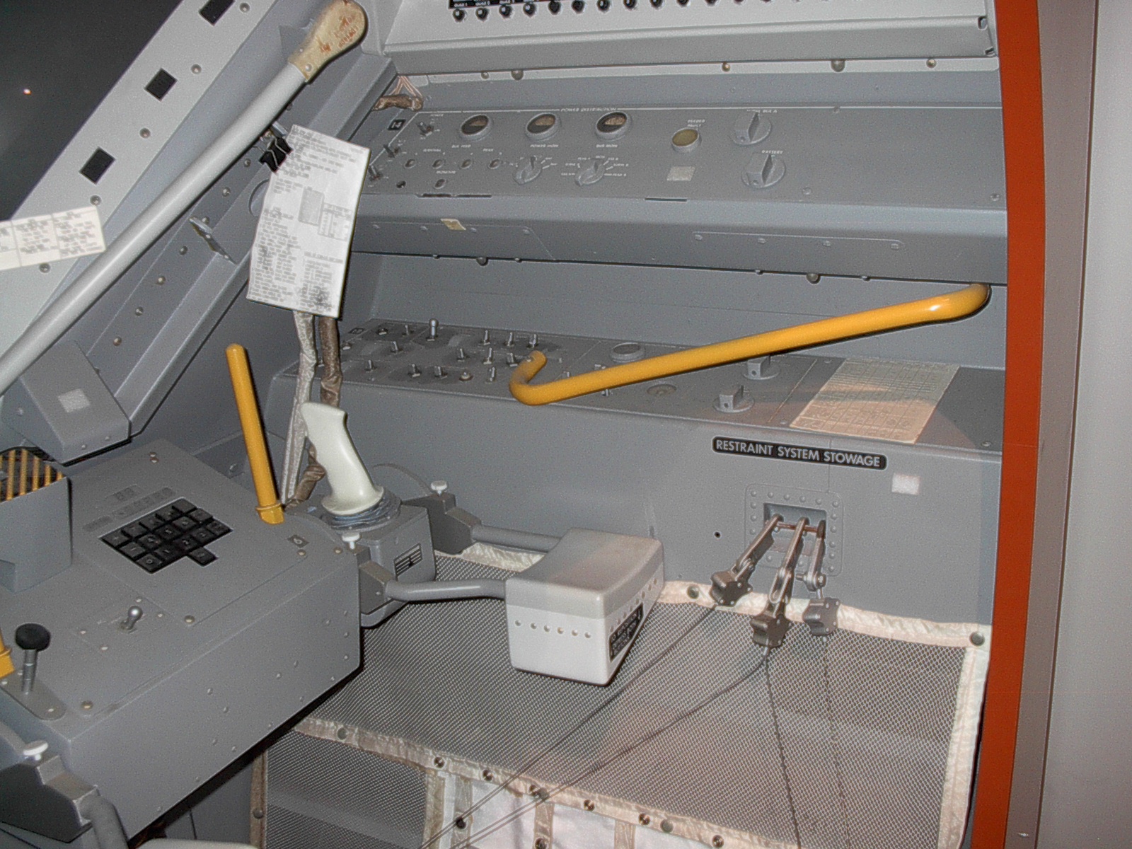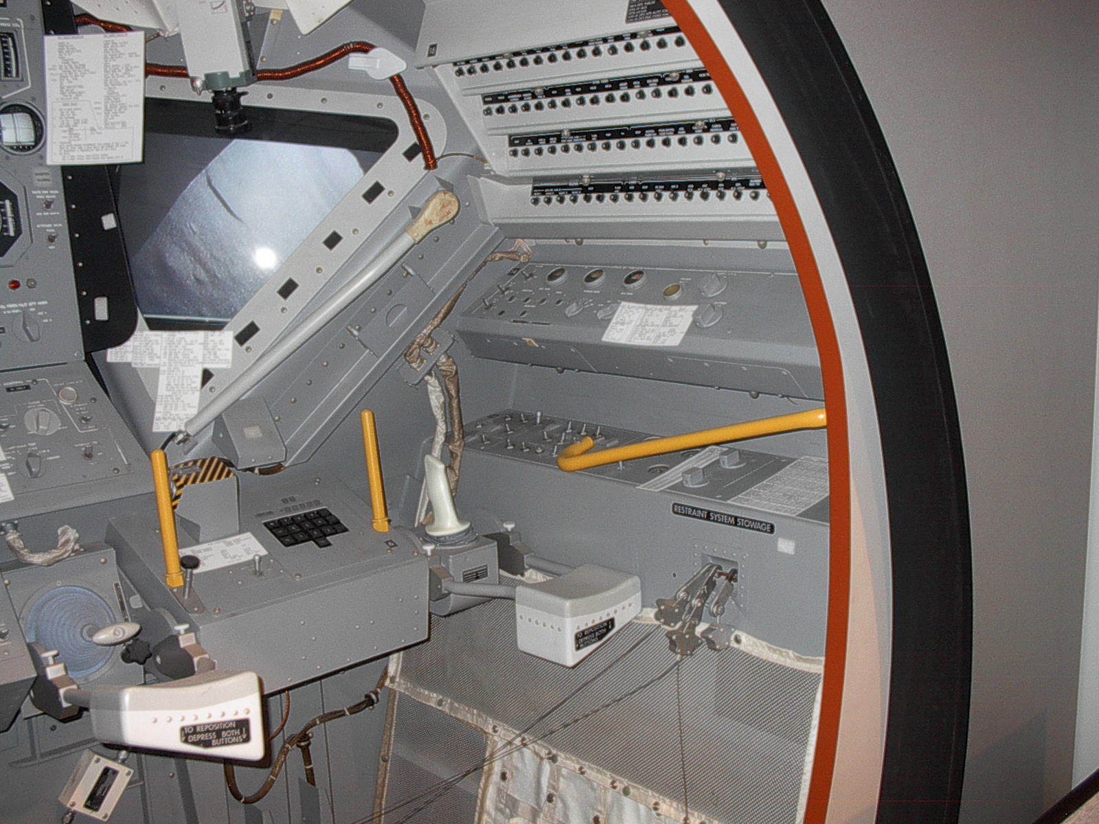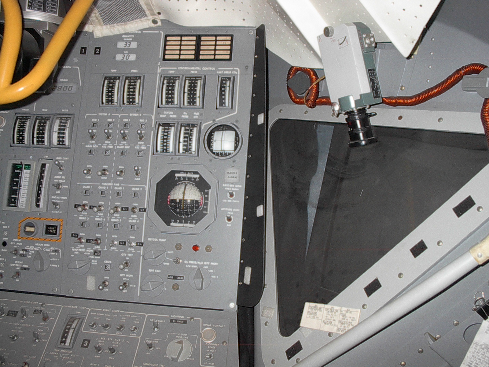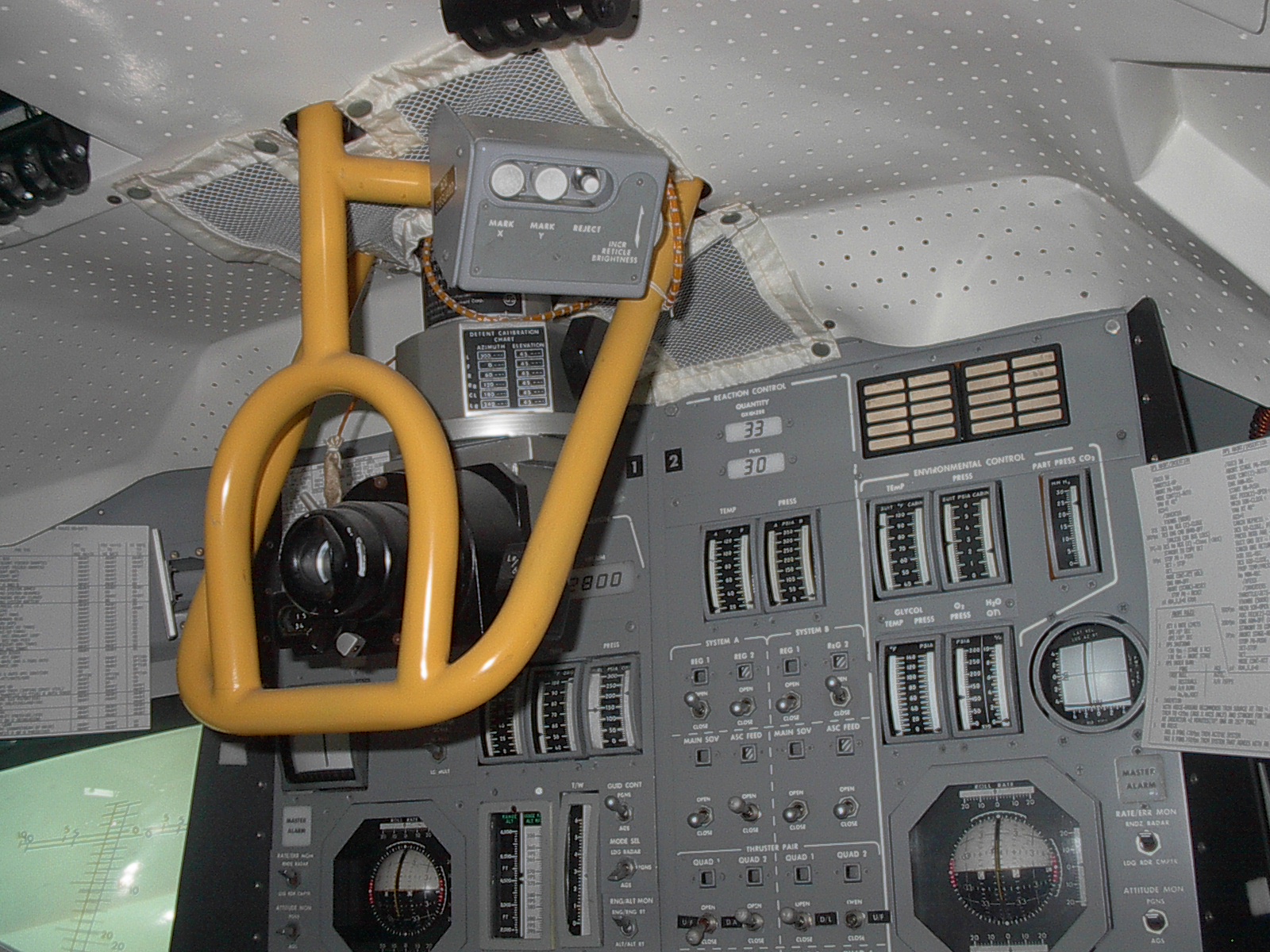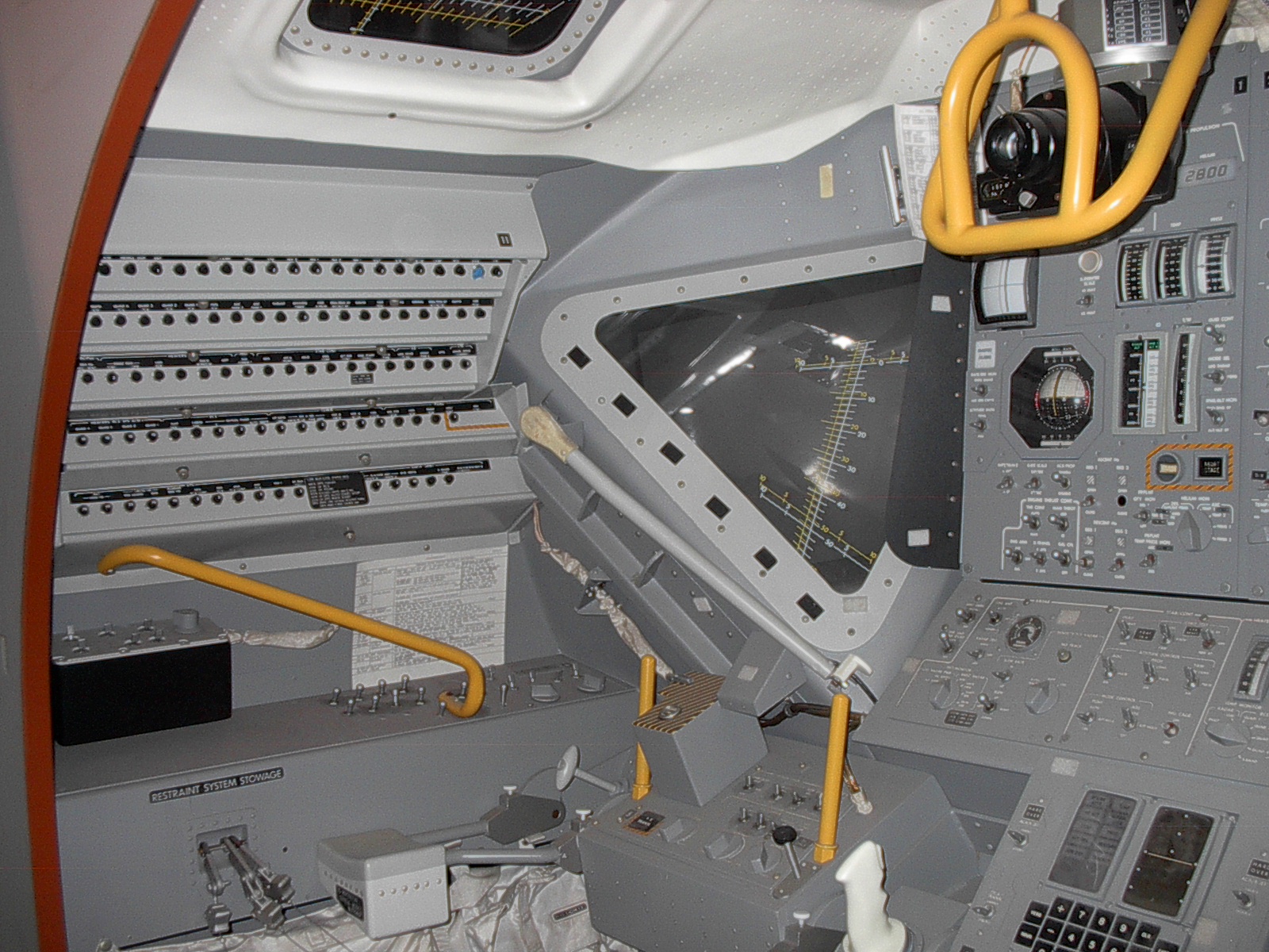 - View from the right rear, looking at the Commander's station. The Commander's Circuit Breaker panel - CB(11) - is on the lefthand wall with the Communication/Pyrotechnics panel below it. The Alignment Optical Telescope (AOT) is at the upper right. ( 712k )