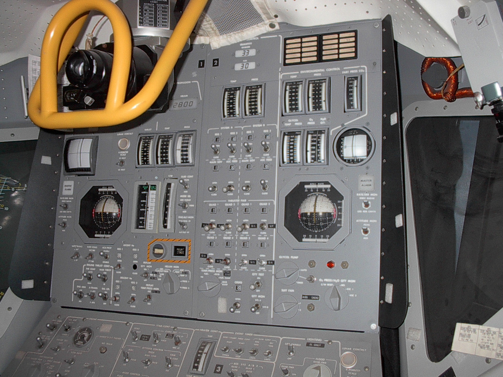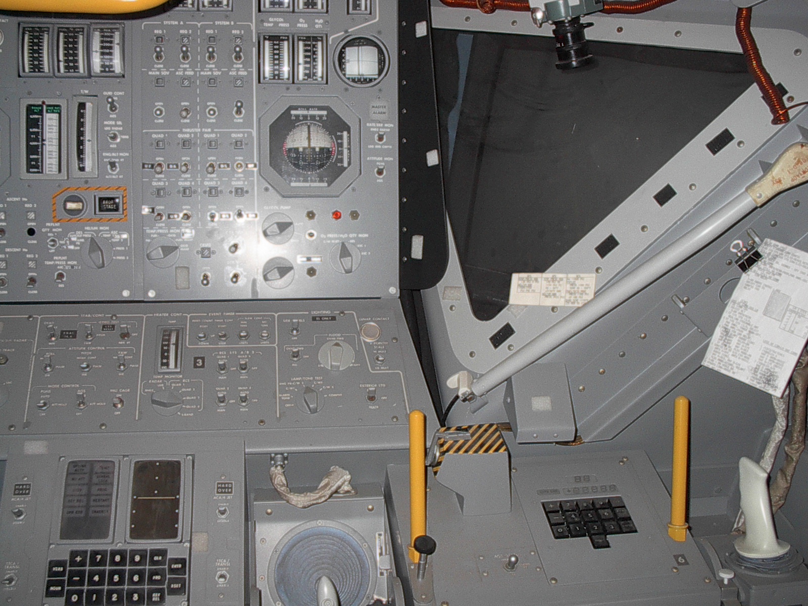 - Primary LMP Flight controls. On the left is the LMP main panel. Below the main panel are controls for Stabilization and Control (both the primary guidance and and abort guidance systems), heaters, timers and lighting. Note the Lunar Contact light at the right on the lower panel. From the lower left to right, the Display and Keyboard (DSKY) of the Primary Guidance System, the LMP's Thrust/Translational Hand Controller, the Data Entry and Display of the Abort Guidance System, and the LMP's Attitude Controller Assembly. ( 696k )
