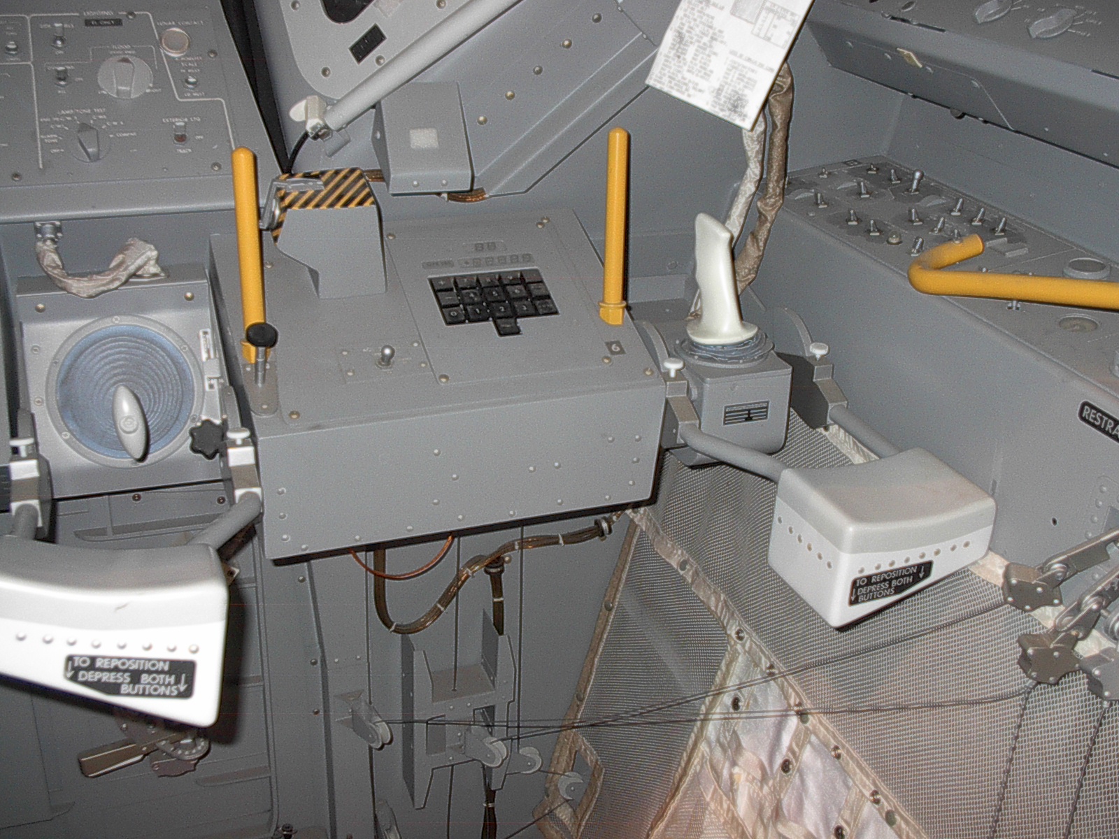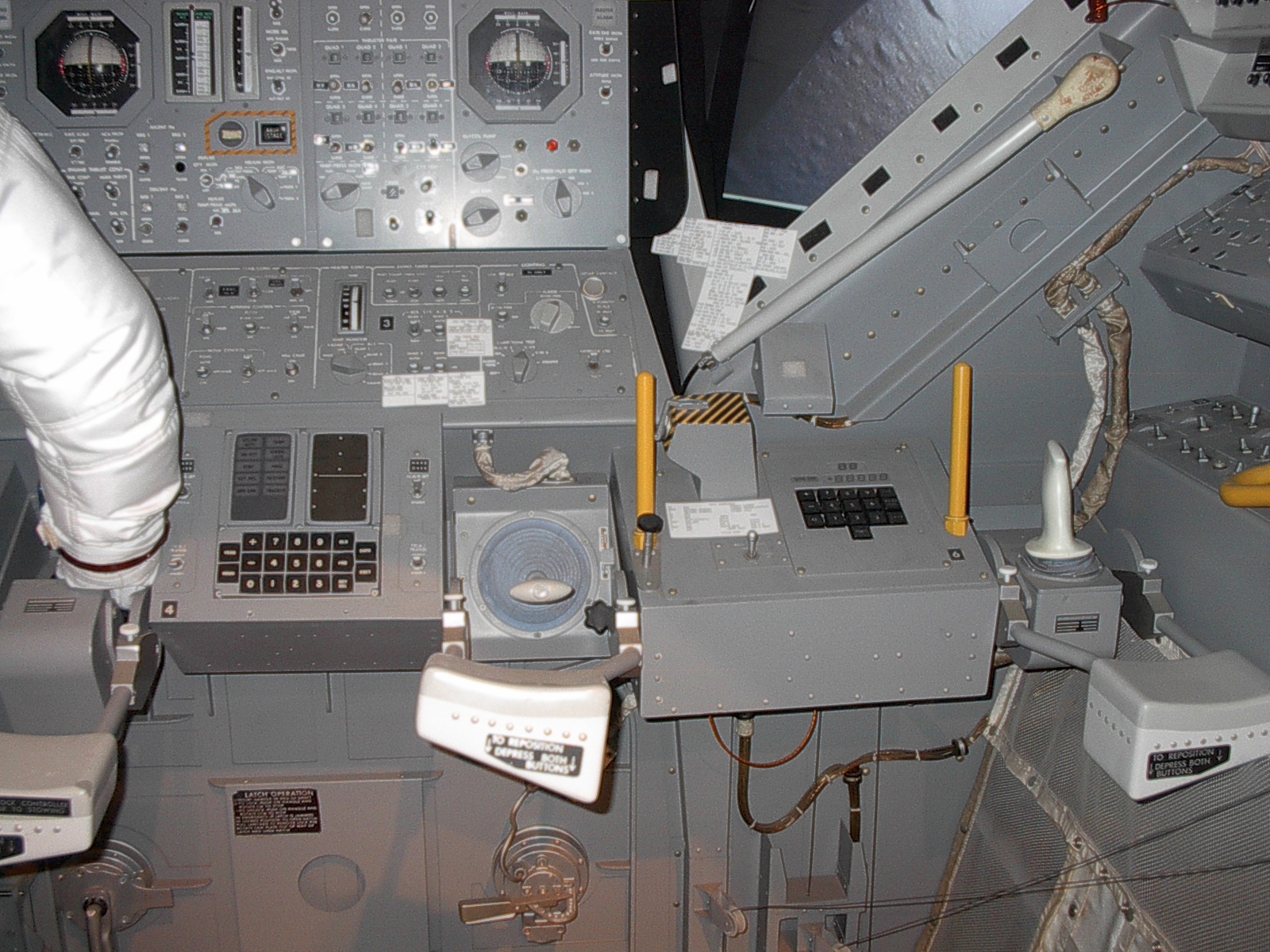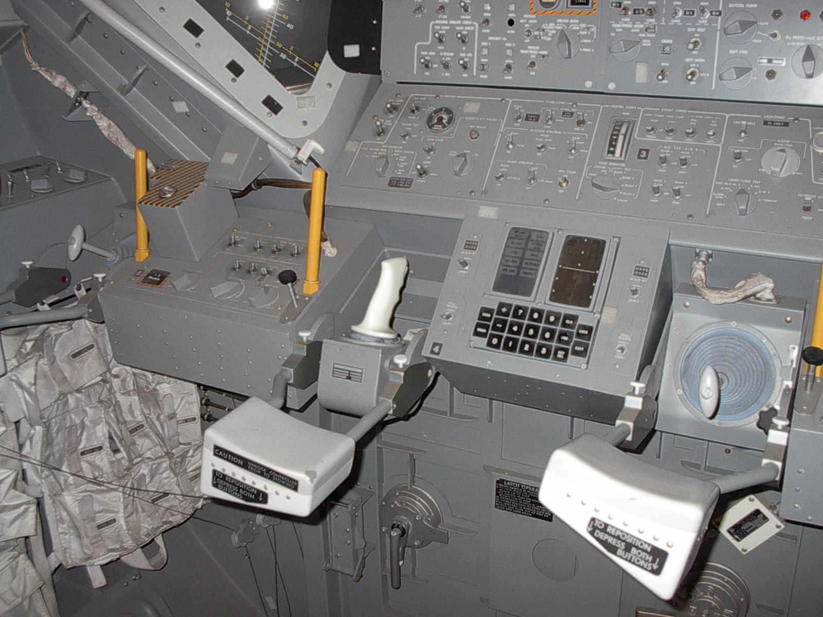 - From left to right, the LMP's Thrust/Translational Hand Controller and armrest, the Data Entry and Display of the Abort Guidance System, the LMP's Attitude Controller Assembly and the Communications panel. ( 712k )
