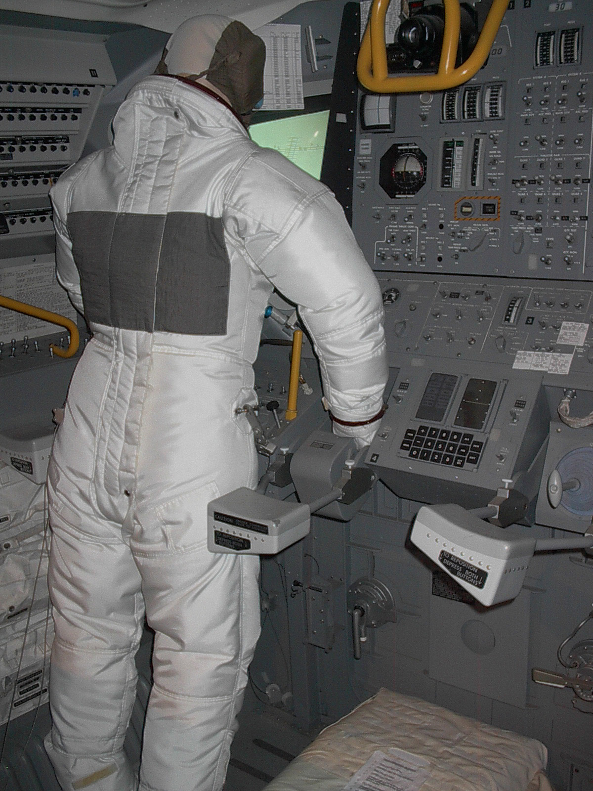 - Central Instrument Panel with manikin at CDR Station. Note the position of the manikin's arms in the armrests, the proximity to the window, and use of the Waist Restraint Harness ( 720k )