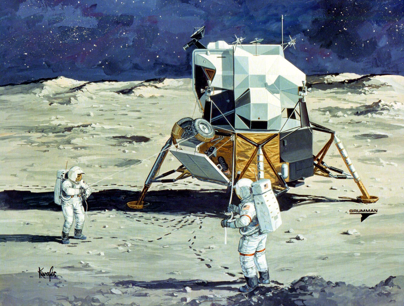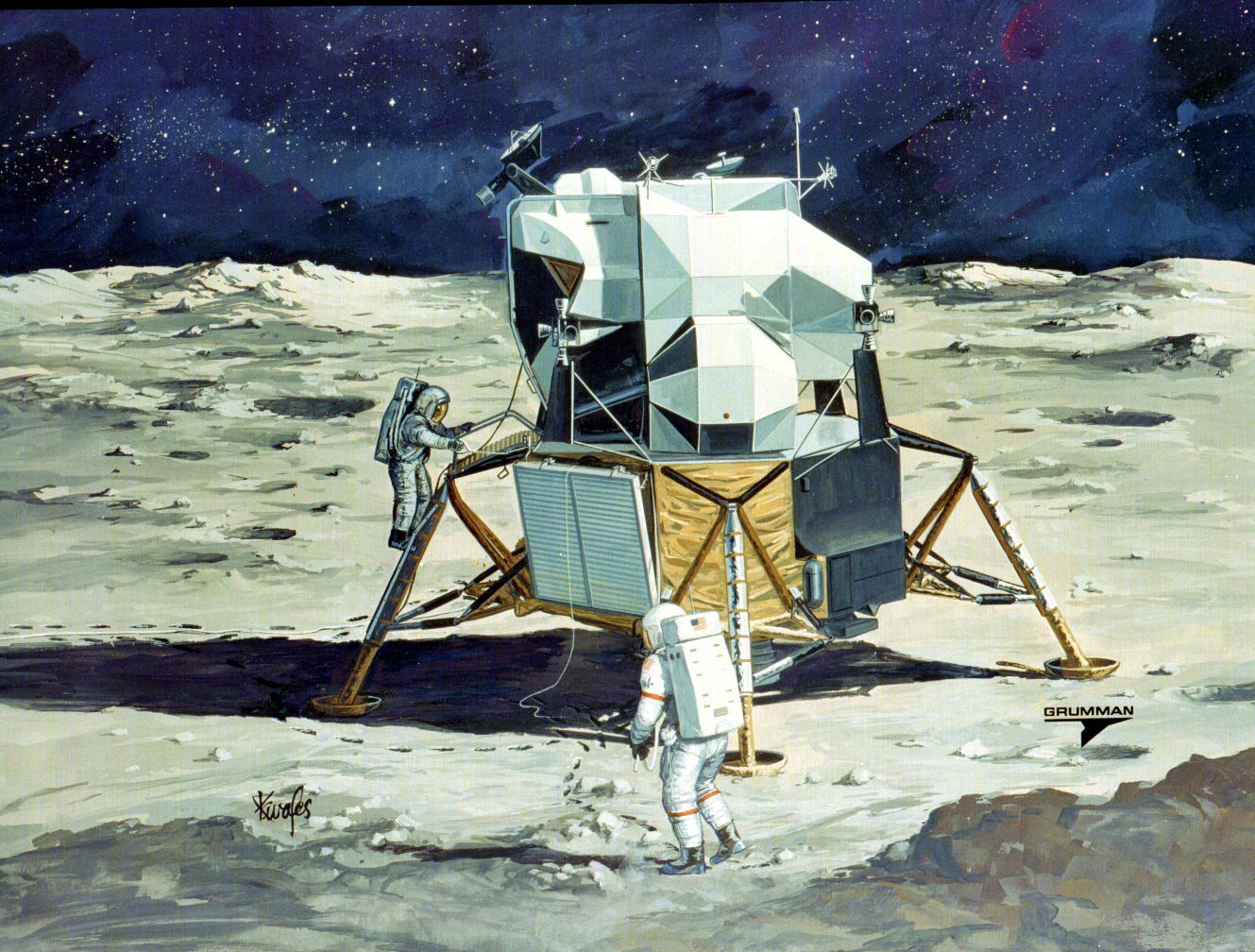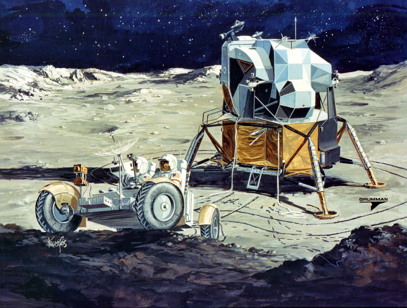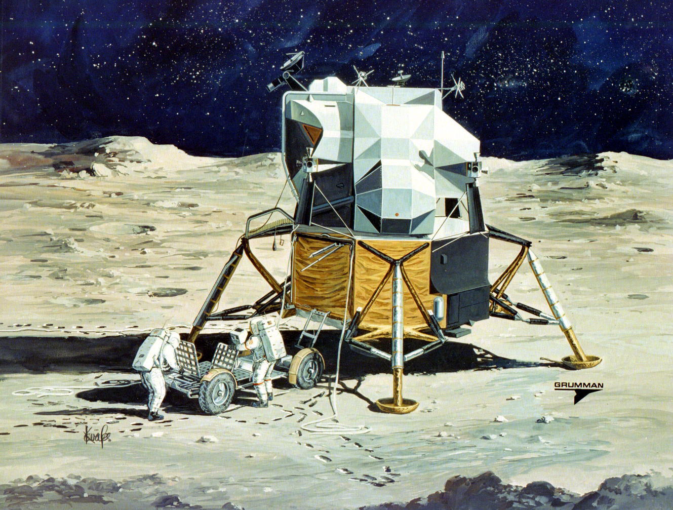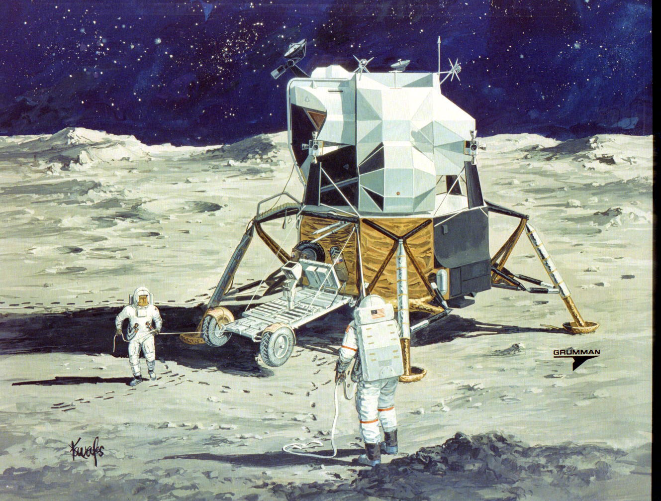 In the Grumman cartoons that follow, the rugged terrain, stars, and mottled sky all result from unrestrained use of artistic "licence". Sigh.