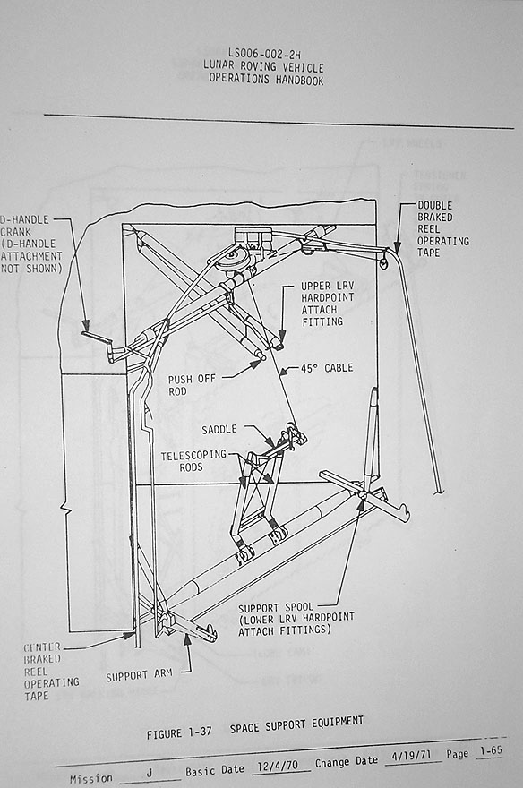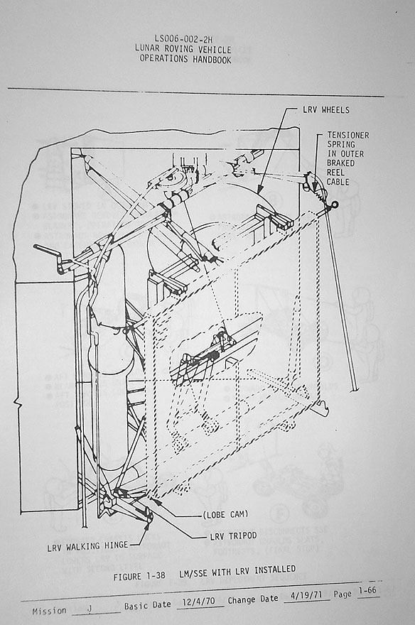 Additional information on LRV deployment is available in the Lunar Roving Vehicle Operations Handbook, Boeing document LS006-002-2H. Figures 1-37 and 38 in that document show the attachment and deployment hardware. Figure 1-39 is a cartoon of the deployment sequence. Section 1.9.3 of the document contains a complete description of the deployment.