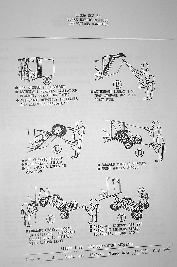The LMP is on the ladder (left) having just pulled the D-ring to release the Rover package. Click on the image for a larger version.
