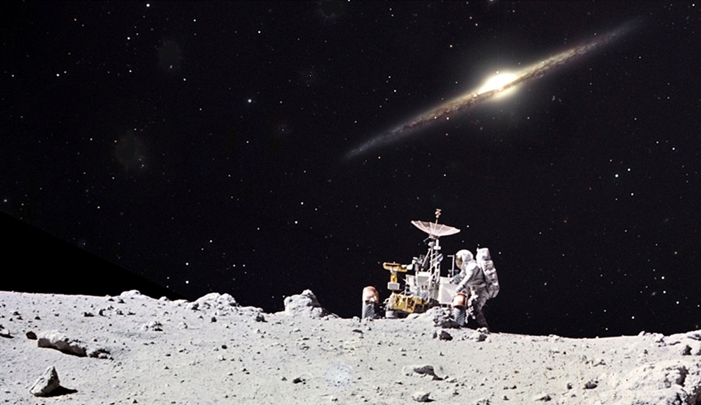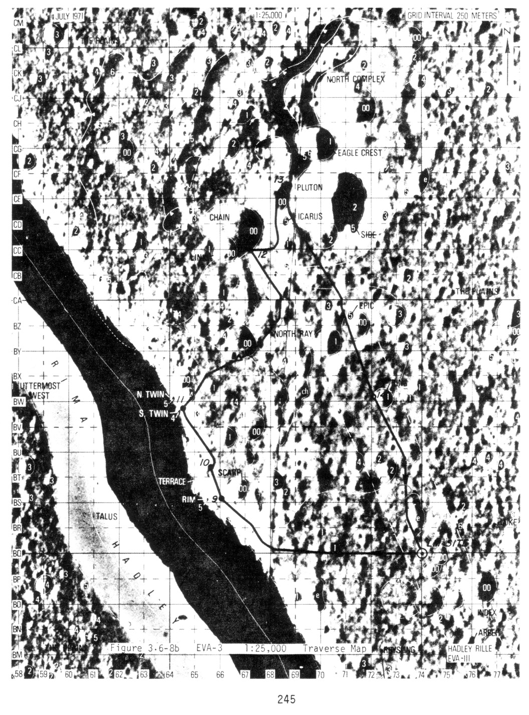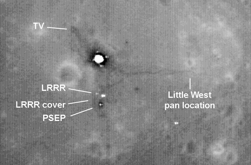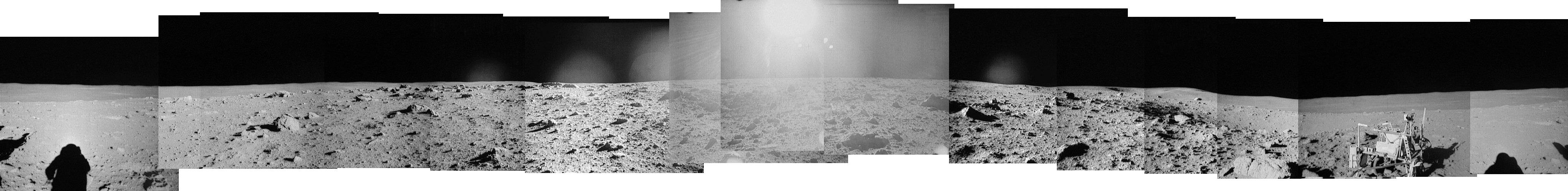 "What started as an exercise in documentation (producing the serious pan), spun-off a nice bit of fun, but there's a serious side to this image, and that's the fact that it is an exceedingly good illustration of the difficulty of judging distance on the lunar surface. In the real pan, I had no difficulty in accepting that the valley is 10 km wide, and that the South Massif is 2,500 meters high. I would never have guessed that from looking at the picture, but I can accept it without it jarring. That's the problem that the guys faced. Only, in their case, there was nobody to tell them how far away things are. Of course, they knew from their maps that the valley was that wide, and that the massif was that high. But how large are those craters out there? And, hence, how far away are they? In fact, the big crater behind the rock is Henry, and it's a kilometer or so off. I know that because I have the map, too. But I couldn't have said without it. By placing a little Jack Schmitt on its rim (borrowed from a pan at Camelot, where he was caught running back to the Rover), that crater suddenly becomes a whole lot closer, and a lot smaller. In the real world, if he'd really been on the rim, he'd have been no more than a pixel high."