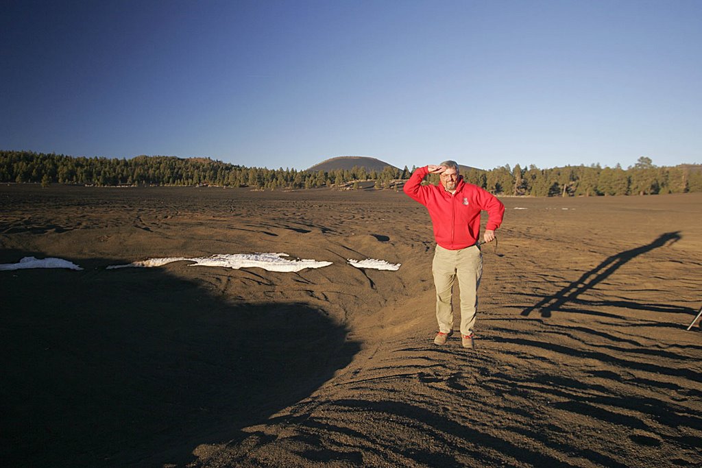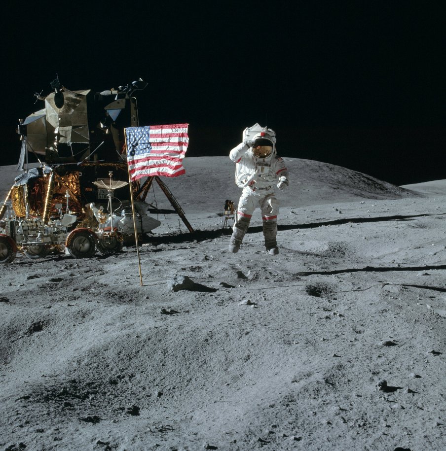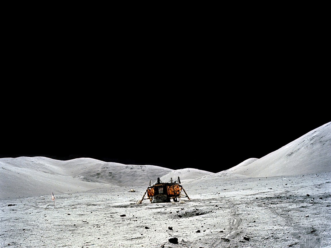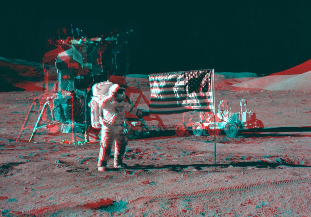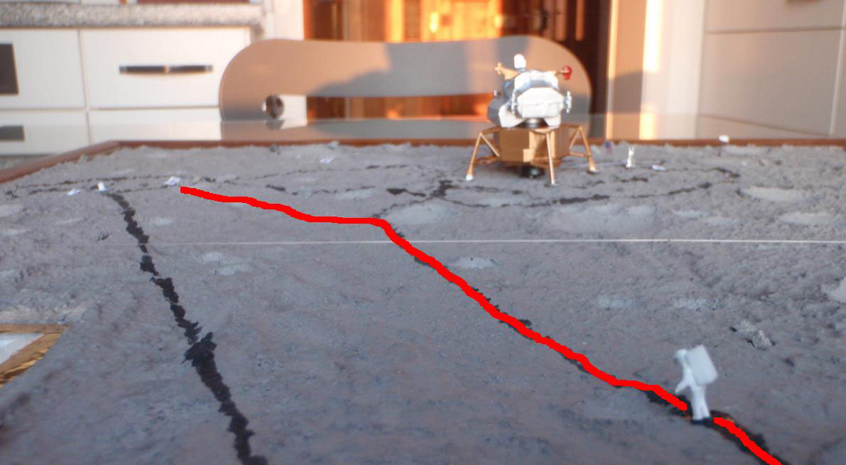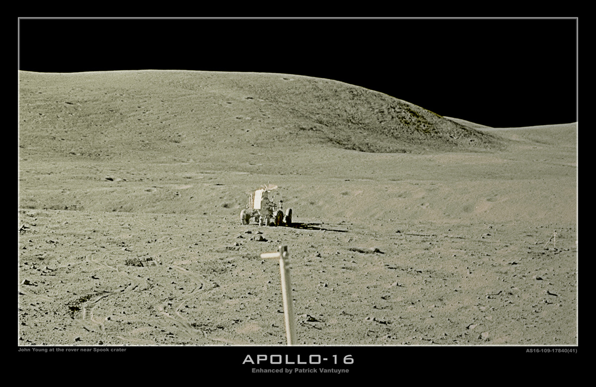 "Inspiration struck, however. Expanding Jack hadn't worked, but shrinking him might, so I leapt out of bed and hunted for another frame of that scene, with him in; but I hadn't downloaded much Apollo 17. I'd been working on Apollo 15 and 16, and was only just starting reading up on 17, so I didn't have that shot on file. As a joke, I stole a picture of Jim Irwin saluting Old Glory on the Plain at Hadley, a high-definition frame which I'd received in the mail a few hours earlier from Kipp Teague, as a swap for sending him the pan of Tracy's Rock, and I shrank him down and stuck him on top of the rock. It was magnificent! So I went back to bed feeling pretty pleased with myself."