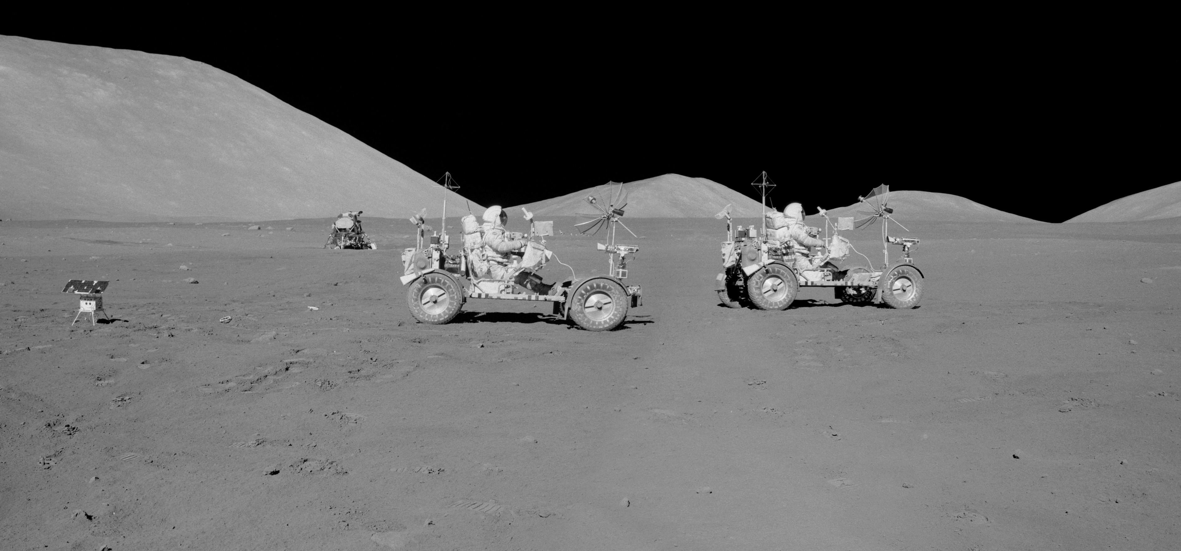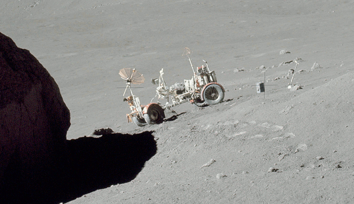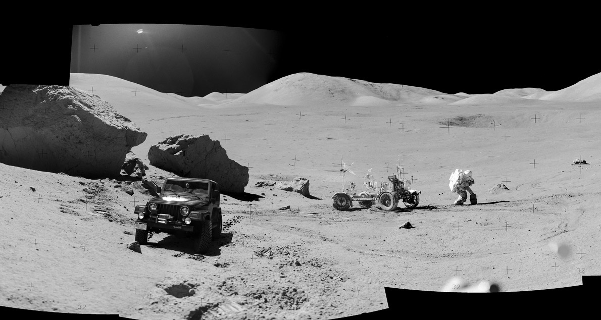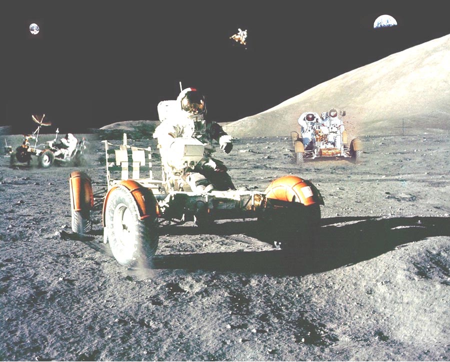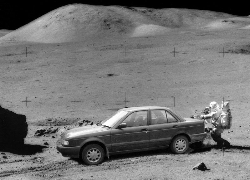 Carlos's creation reminds me of the outrage expressed by some in the media and in Congress when they learned that NASA had spent 31m (US, 1970) developing the Lunar Roving Vehicle. After all, they said, perfectly good, new cars could be bought for under $4000 at any automobile dealership. Carlos shows us what might have happened had these worthies had their way. Ignoring such minor problems as the difficulty of getting even a small sedan to the Moon, the problem of running an internal combustion engine on an airless world, and the basic question of how a suited astronaut would gotten in the front seat and worked the controls, it seems to me that the real showstopper would have been this: having seen a rental car buried up to it hub caps in dry sand on a Hawaiian beach (no, I wasn't the driver, just the passenger), I don't think that a Ford or Chevy sedan would have handled conditions at Hadley, Descartes, or Taurus-Littrow very well. ;-)