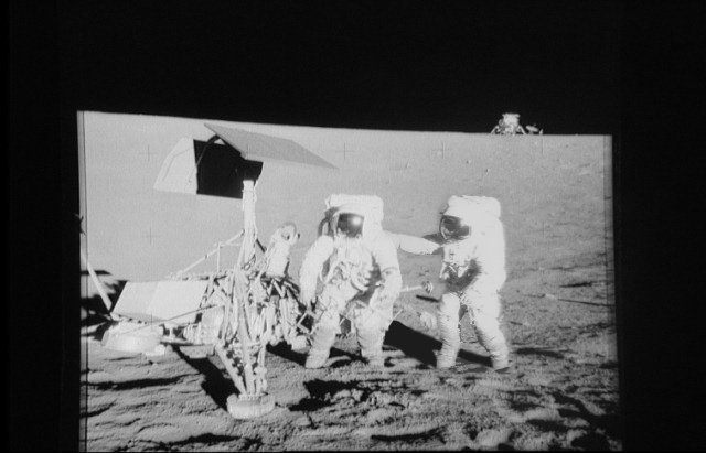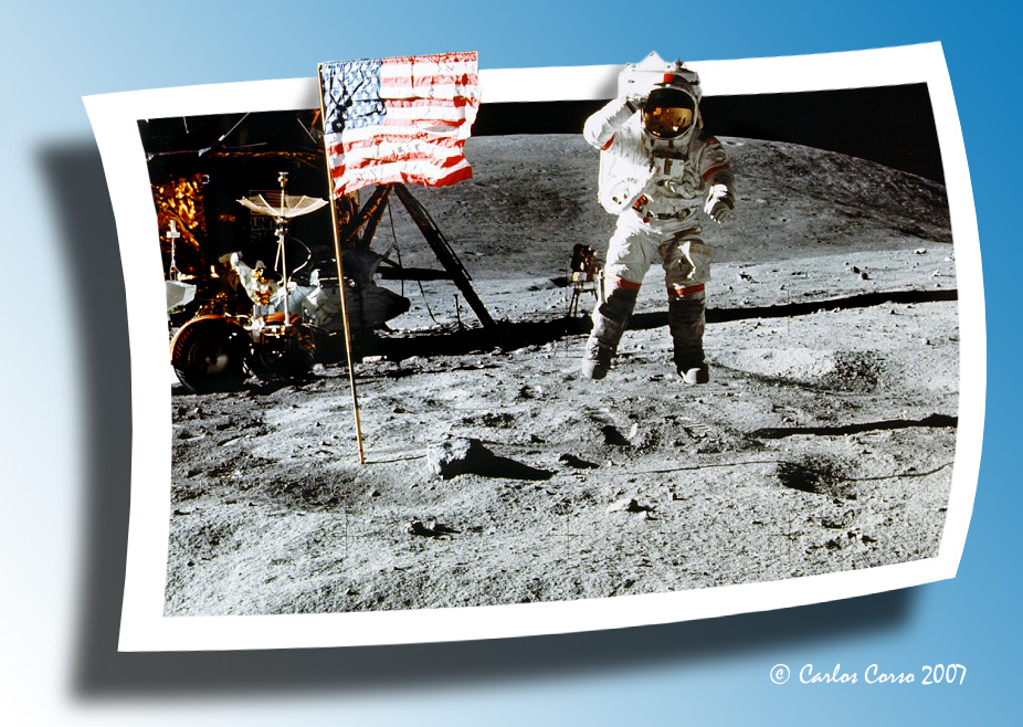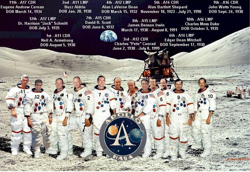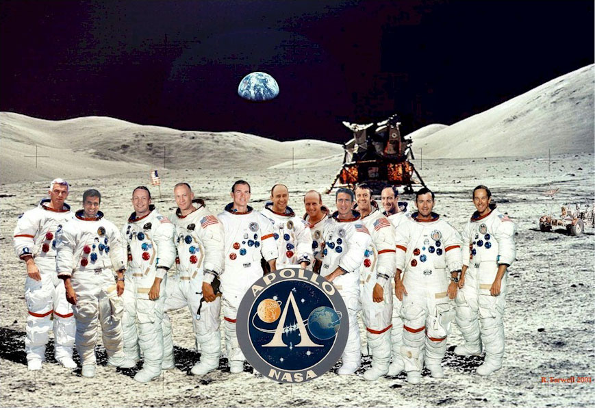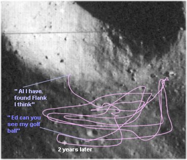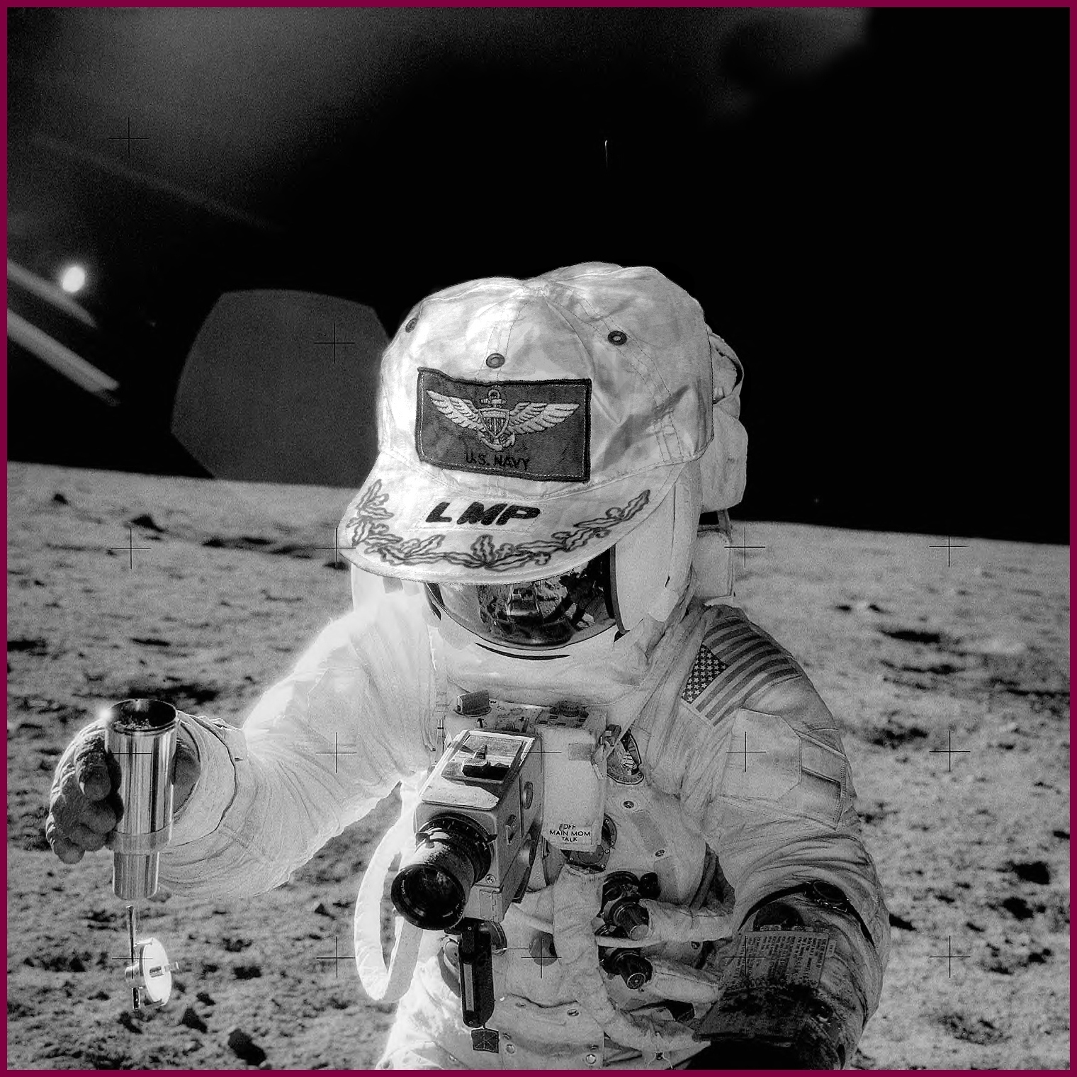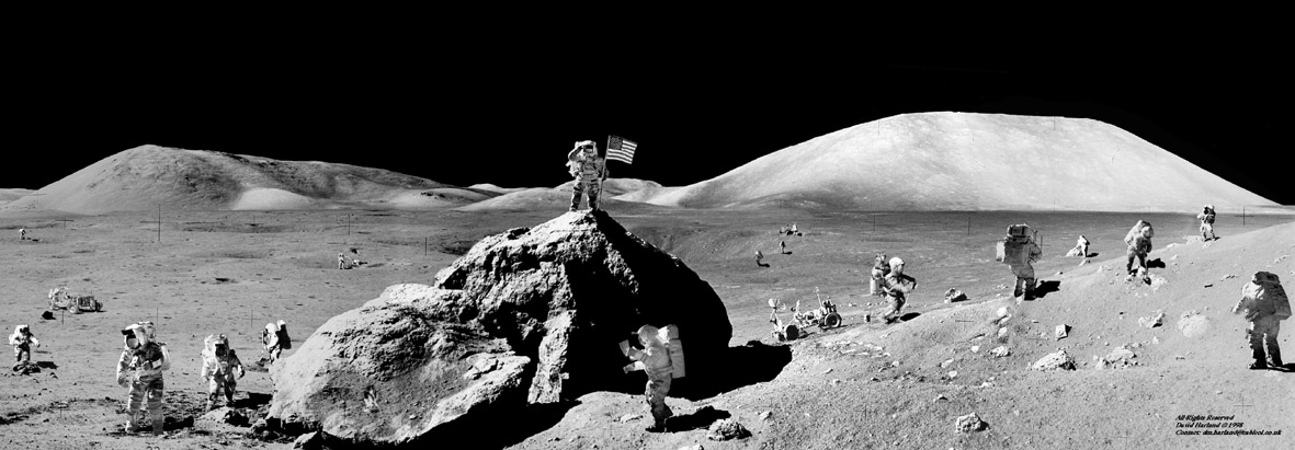 "The next day, I took another look. It was still magnificent. So I borrowed a few more shots of those intrepid moonwalkers Dave, Jim, John and Charlie, and put them in too. It was truly hilarious! Over the last week or so, I've added some of Al (Shepard), Ed and Buzz. I belatedly sought out a few of Gene and Jack and put them in. I'll see about Pete and Al, and might even put in their Surveyor. There wasn't a Neil available, however; so, although he was the first to tread the lunar dust, he isn't represented here, but this is probably for the better because he never did like crowds."