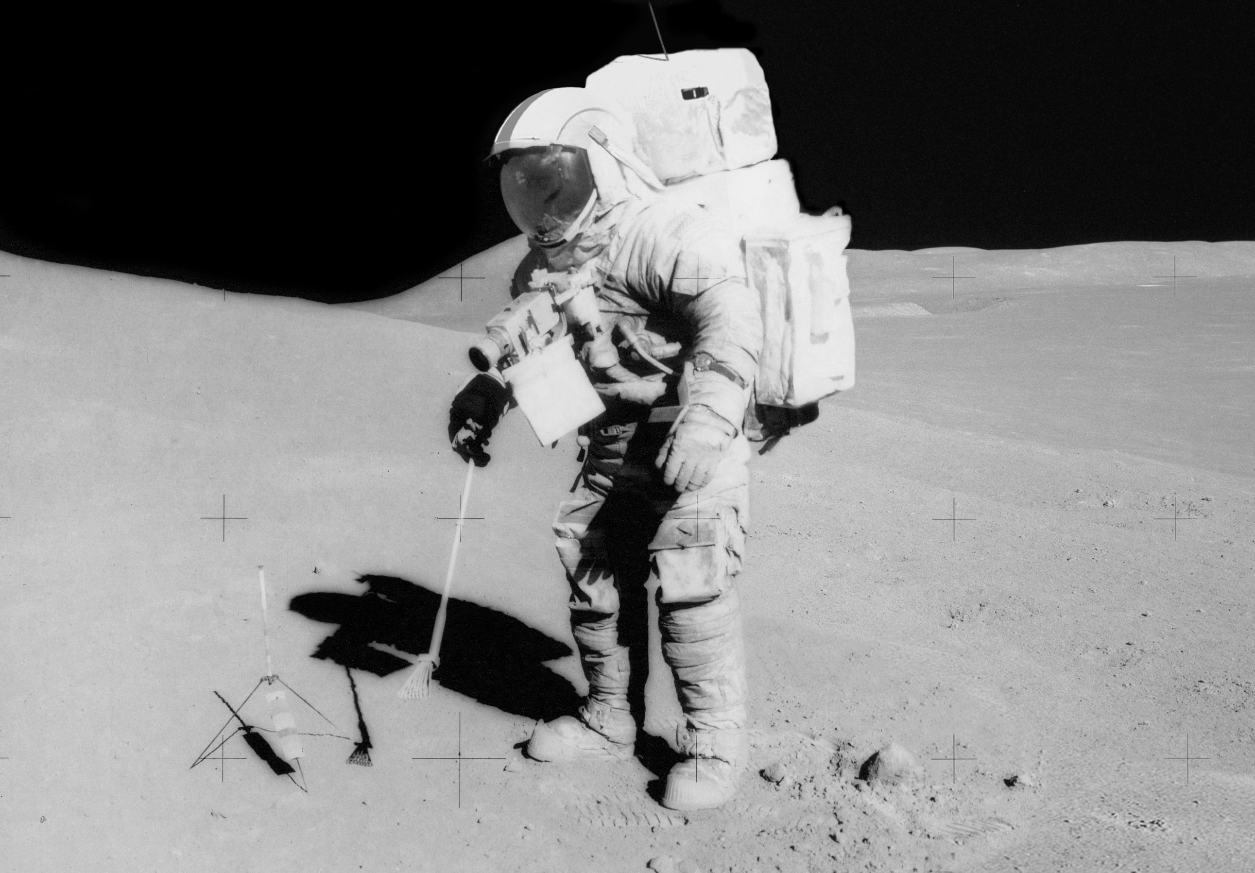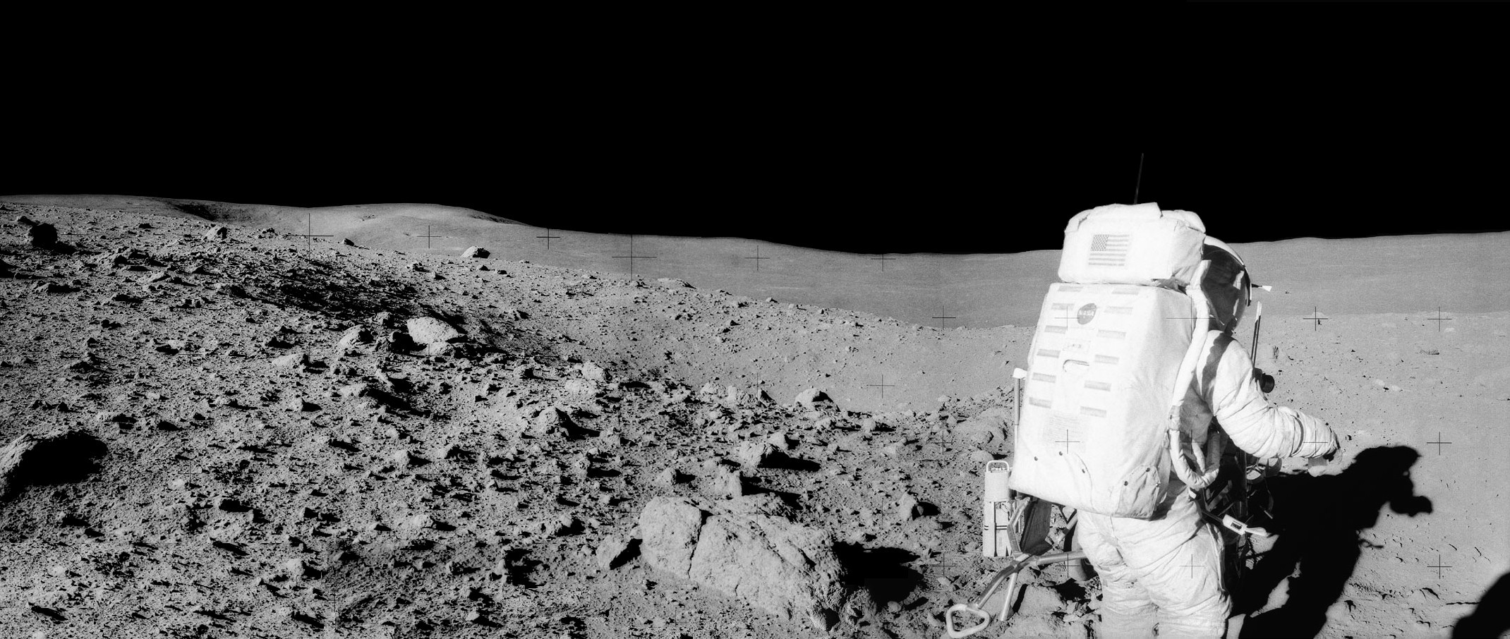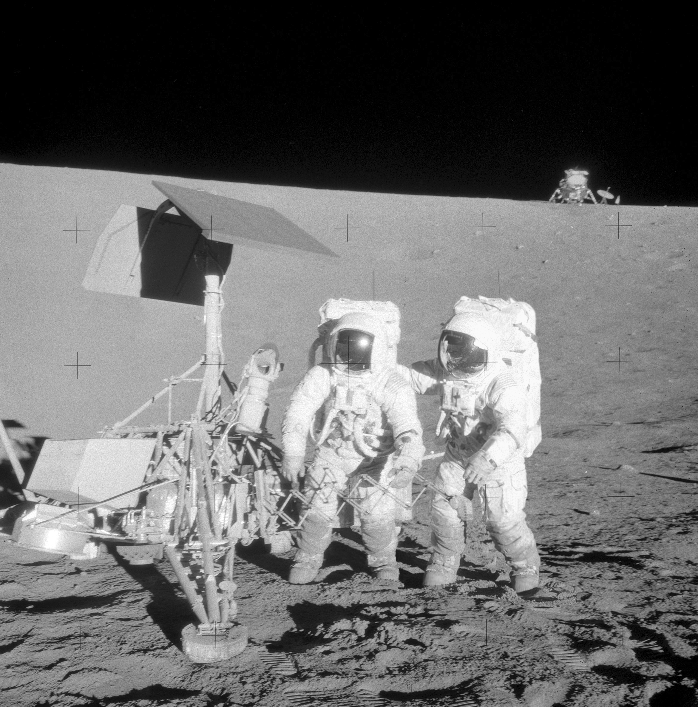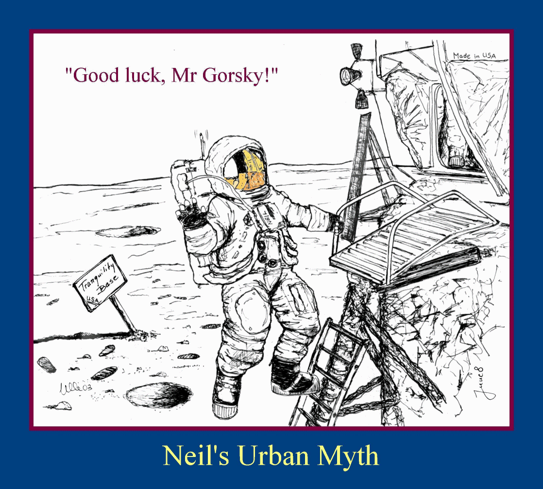 "The next day, I took another look. It was still magnificent. So I borrowed a few more shots of those intrepid moonwalkers Dave, Jim, John and Charlie, and put them in too. It was truly hilarious! Over the last week or so, I've added some of Al (Shepard), Ed and Buzz. I belatedly sought out a few of Gene and Jack and put them in. I'll see about Pete and Al, and might even put in their Surveyor. There wasn't a Neil available, however; so, although he was the first to tread the lunar dust, he isn't represented here, but this is probably for the better because he never did like crowds."