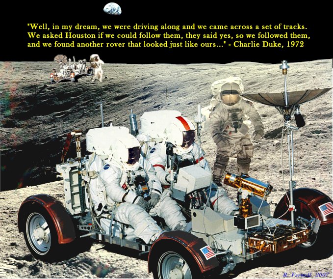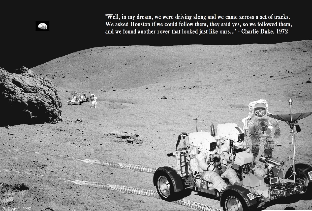 Bob Farwell has created two composite visualizations of Charlie's dream: one in color and one in black-and-white. The first of these is set at Plum Crater. The second at Station 13. With regard to the latter, Bob writes, "I used AS16-106-17394 and 17395 as the background, enhanced the gray scale values, combined the two into one (almost) seamless image, and removed the reticules. I deleted the reticules because I wished to make the viewer feel as though they are an actual observer. The tire tracks were 'borrowed' from AS15-82-11056. The foreground rover is from KSC-71PC-777; foreground helmets are from AS17-134-20426; foreground Charlie Duke is from AS16-114-18423; the earth is from AS11-44-6568, the background John Young is from AS16-114-18388, background rover (and reflection in Charlie’s visor) is from AS17-140-21409."