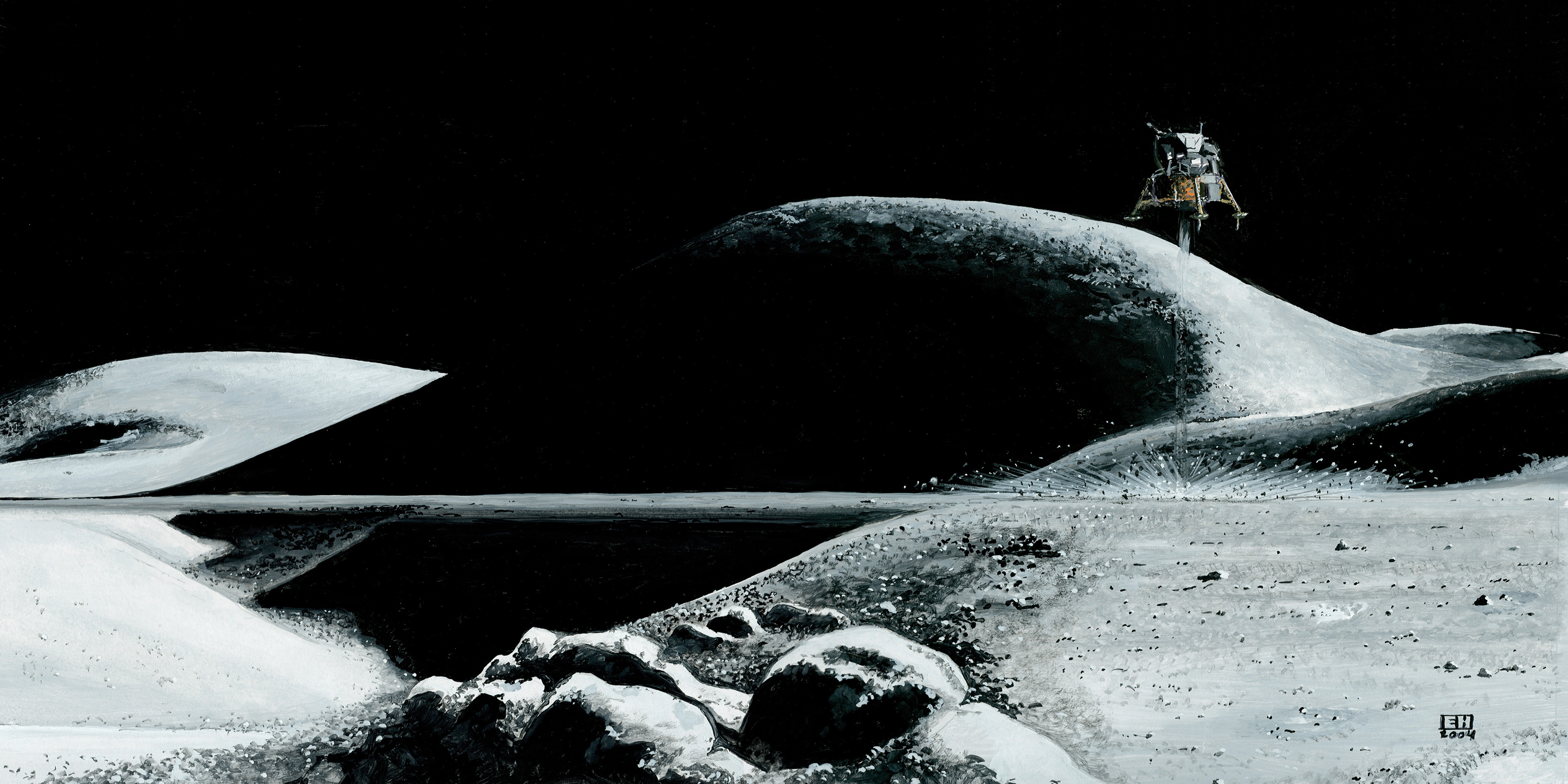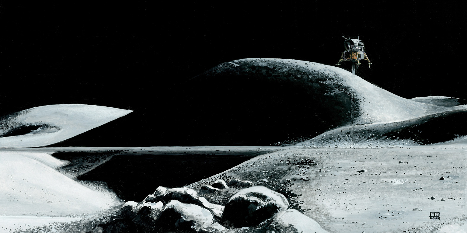 Ed Hengeveld has completed a painting called Landing at Hadley. At the request of the person who commissioned the painting, Ed has exercised a bit of artistic license in showing the landing much closer to the rille than was actually the case. A full-size version is also available.