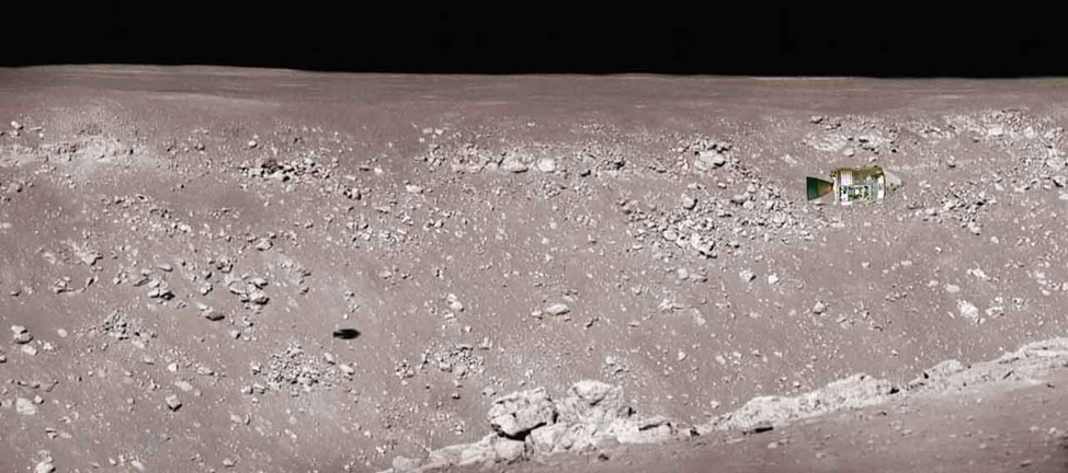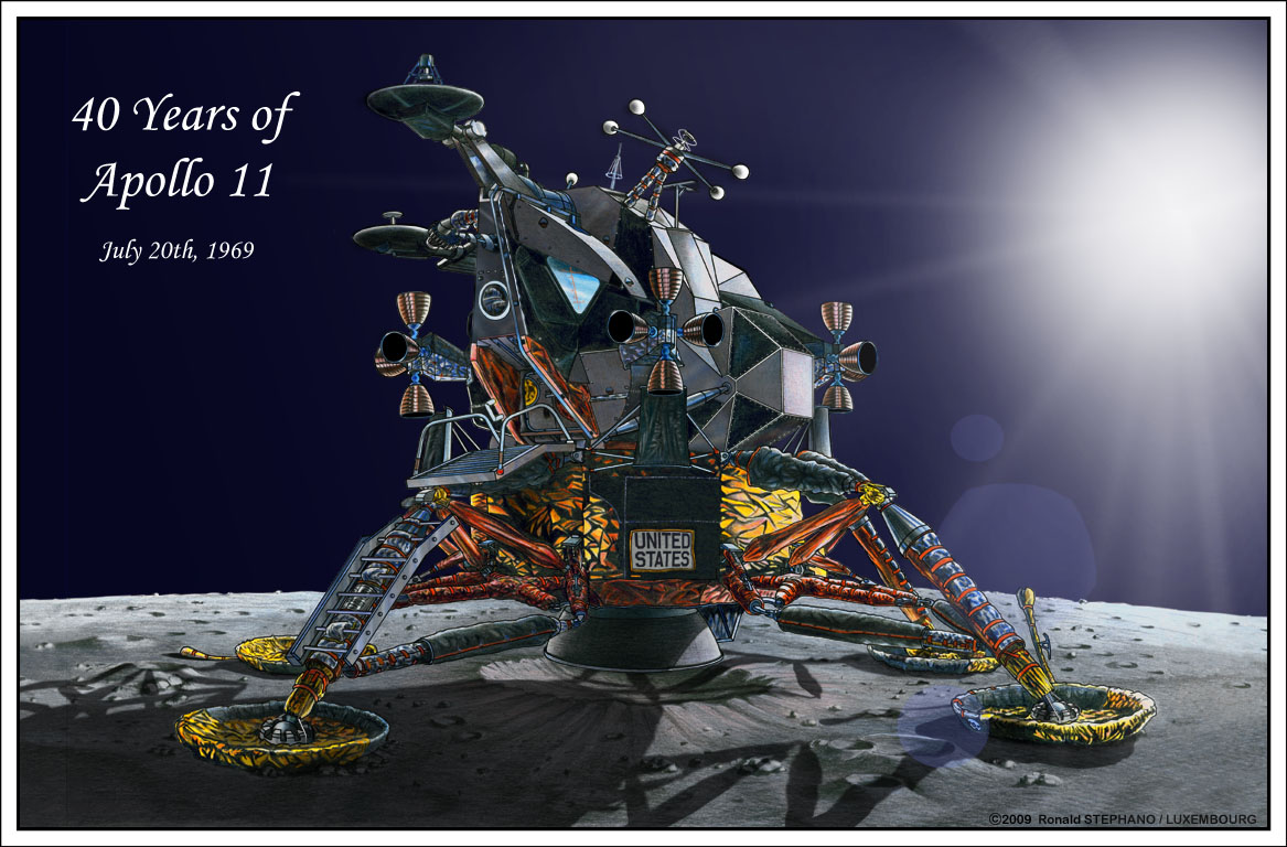 Your friendly ALSJ Editor mentioned to Ron that his LM brought to mind a Sumo wrestler, crouched and ready to charge. "I agree that the overdone large stance of the legs and the 'bent-over' forward face part of the lander give it a Sumo-like appearance - interesting comparison. The artwork is a drawing in the strict sense - colored pencils and china ink, a bit enhanced by CG.