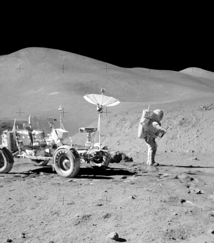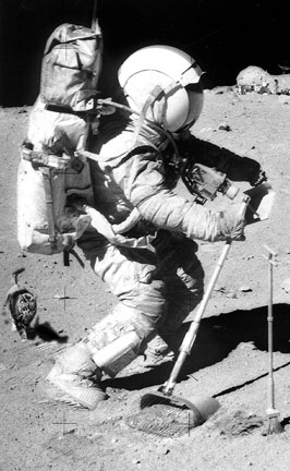 "This image is derived from one that I made as a serious, monochrome rendition of Tracy's Rock (0.5Mb), which is at Apollo 17 Station 6 in the valley of Taurus-Littrow. That image is in the Journal, too. It was based on a set of high-definition frames that were supplied by Mike Gentry at NASA Johnson and were scanned by Ron Wells. I downloaded and mosaicked them. By holding that resolution, I produced an enormous image; but scrolling across it is half the fun!""I saw that Jack Schmitt wasn't in frame, so I went to another frame, which was only 30-cm wide, in which he was present, and borrowed him. But he was the wrong scale, and he didn't blow up all that well; he looked a little fuzzy when I pasted him in, so I deleted him and went to bed in disgust, because without someone in the frame to provide a sense of scale, that block could be any size."